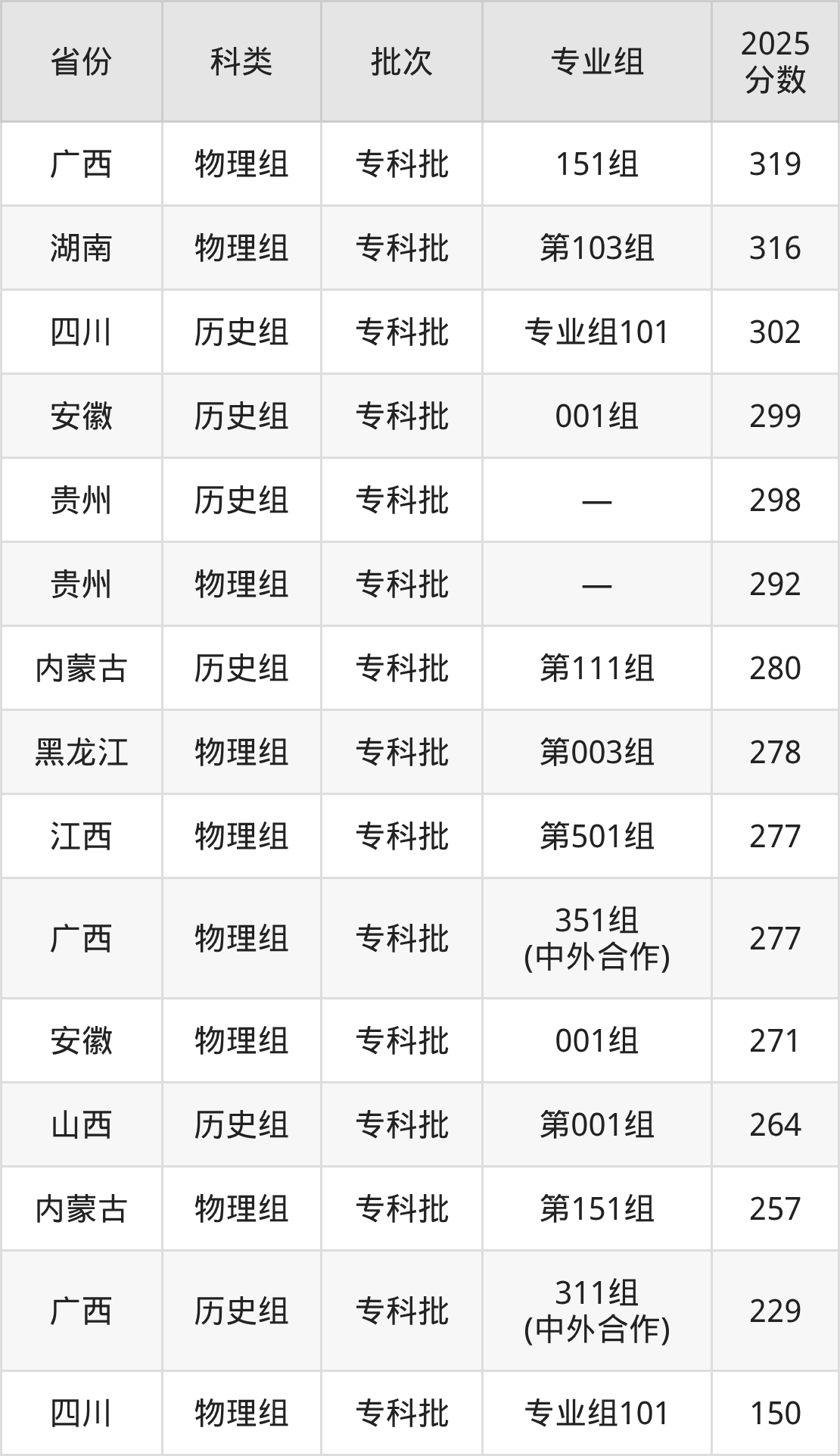 下面是广西幼儿师范高等专科学校2025年在全国各省的录取分数线一览表,供参考: