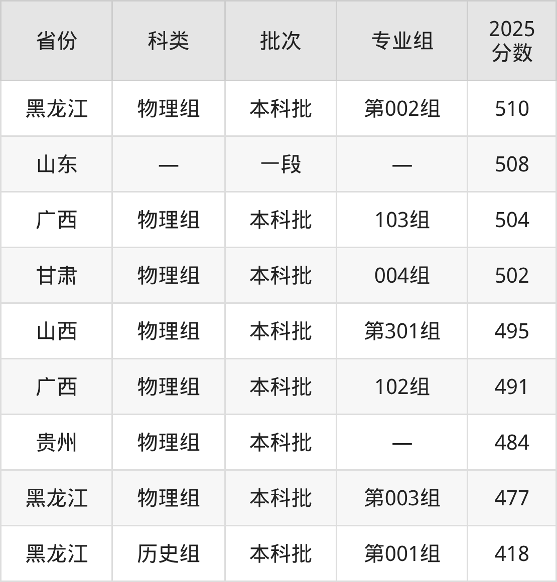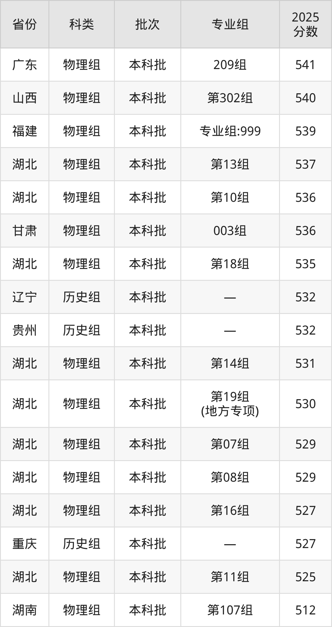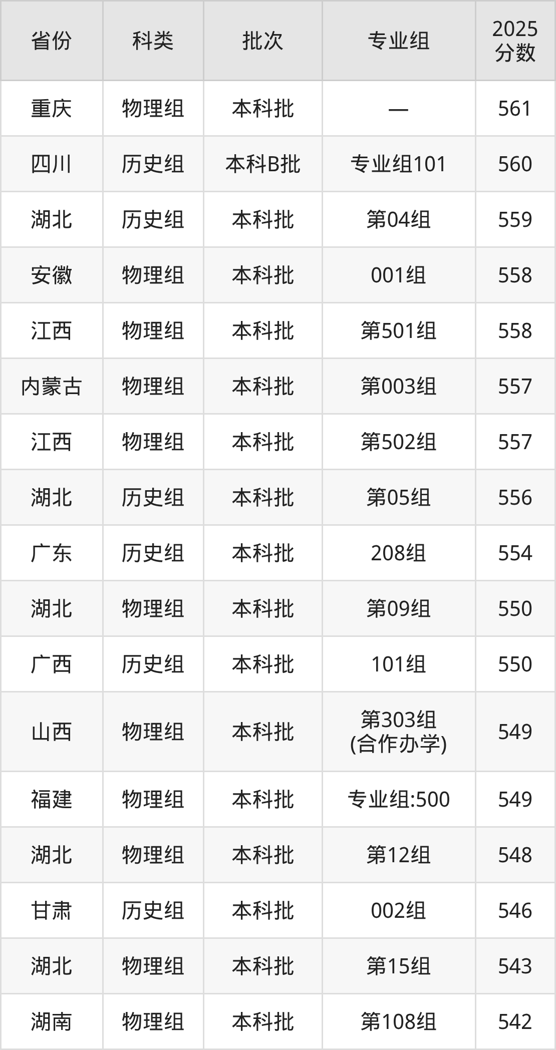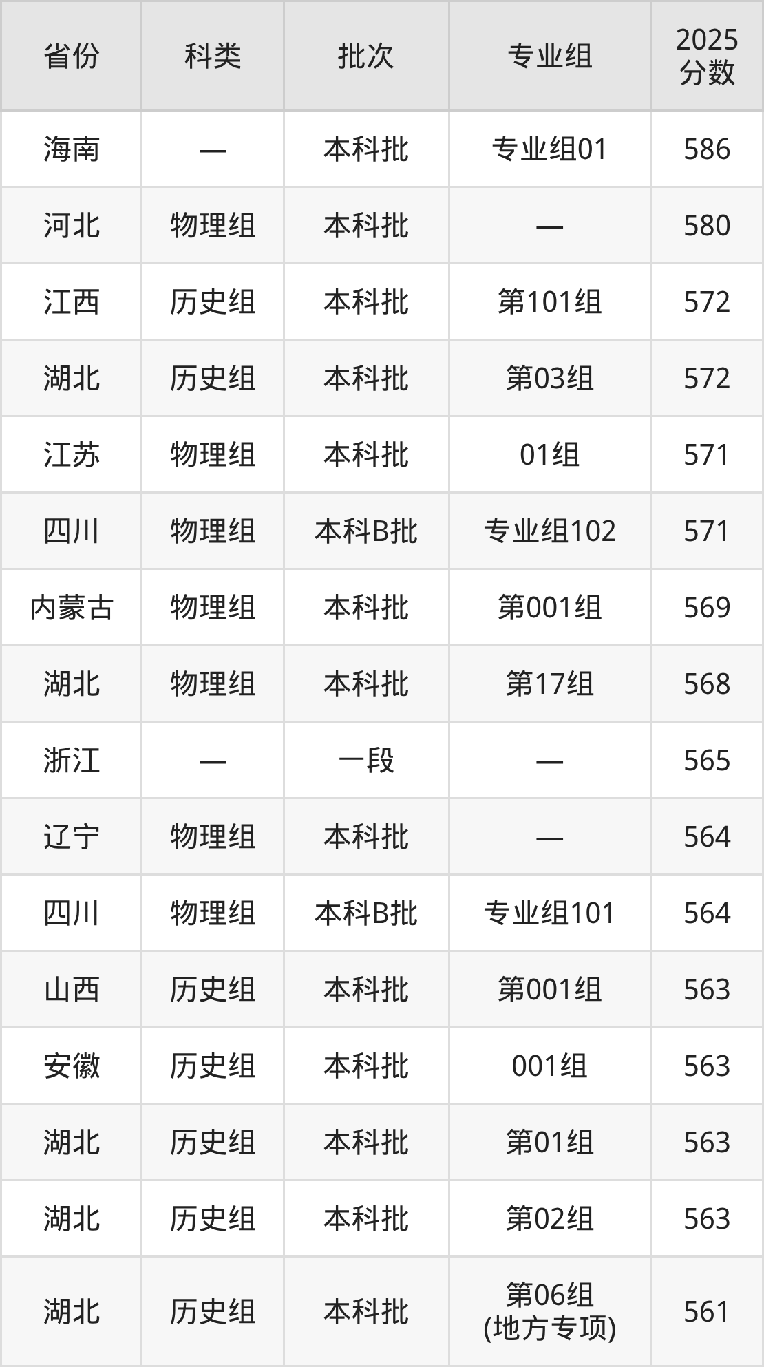 2025年江汉大学在全国普通批次招生的录取分数范围位于418~586分之间,其中省内分数范围为525分~572分,历史组最低分专业组为“第05组”,考生556分即可报考,物理组最低分专业组为“第11组”,考生525分即可报考。