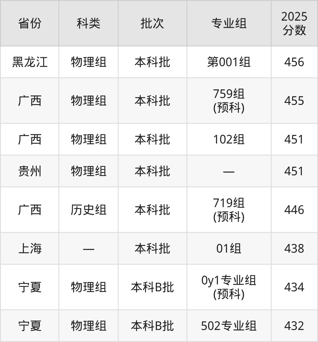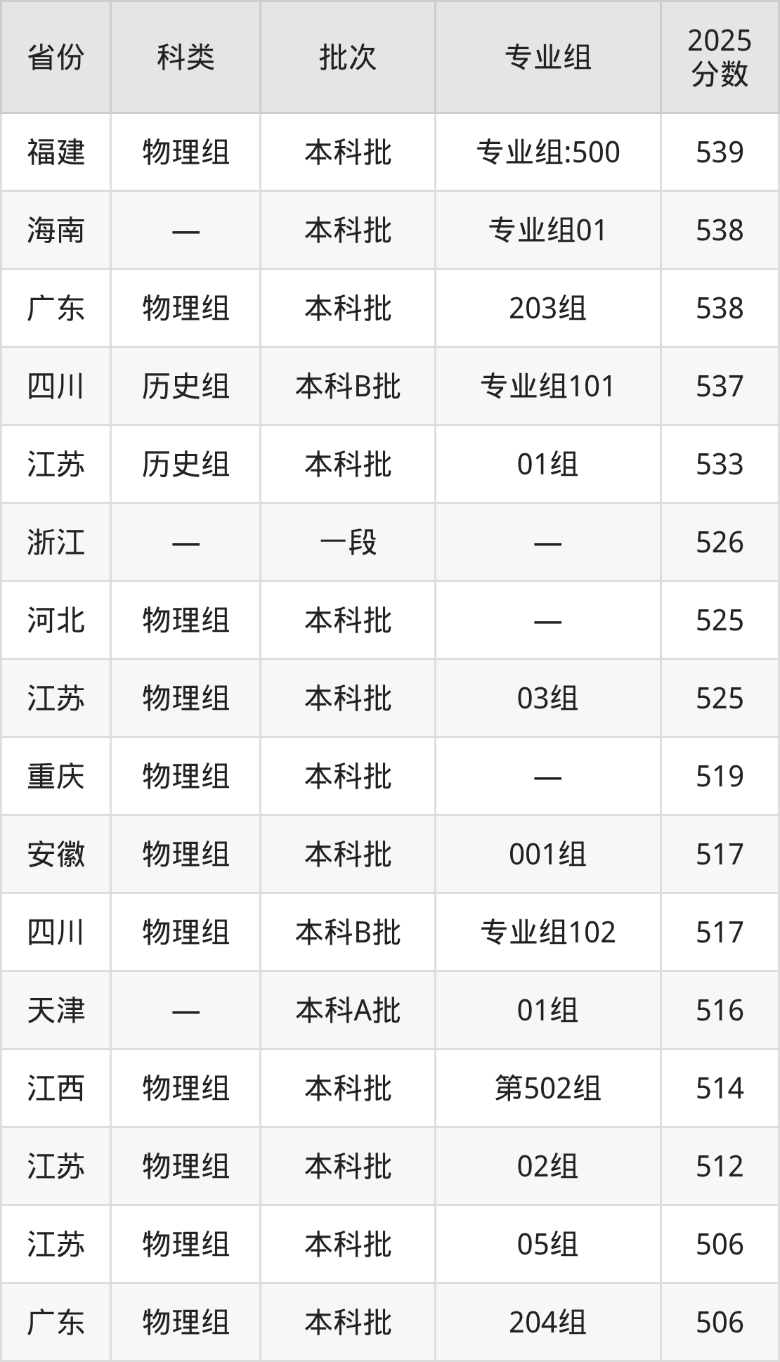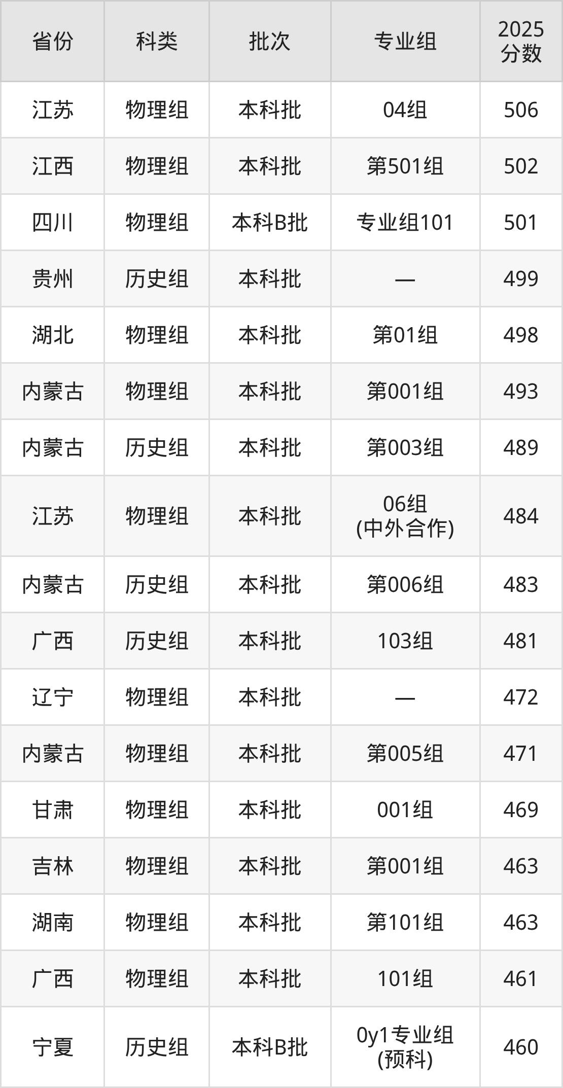 2025年盐城工学院在全国普通批次招生的录取分数范围位于432~539分之间,其中省内分数范围为484分~533分,历史组最低分专业组为“01组”,考生533分即可报考,物理组最低分专业组为“06组(中外合作)”,考生484分即可报考。