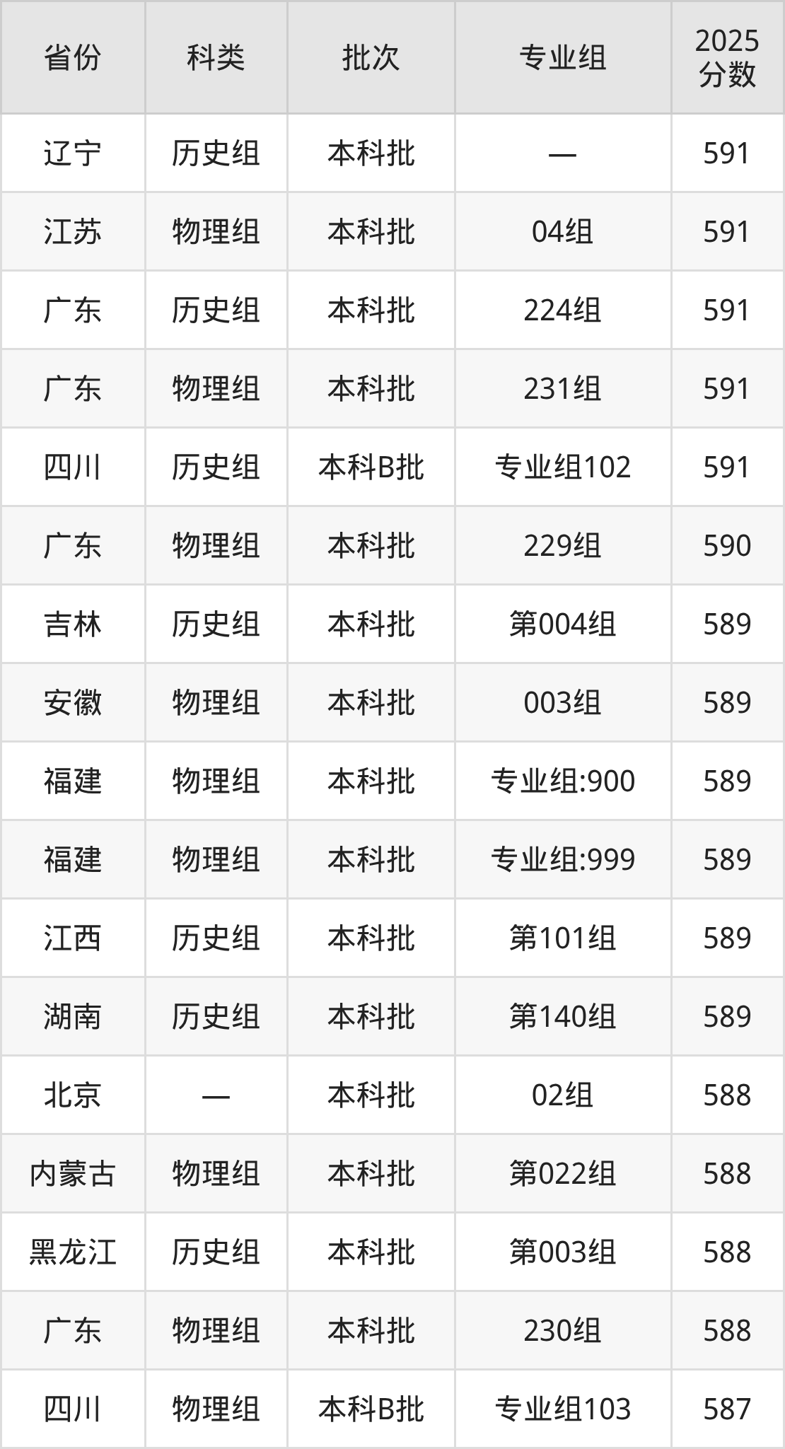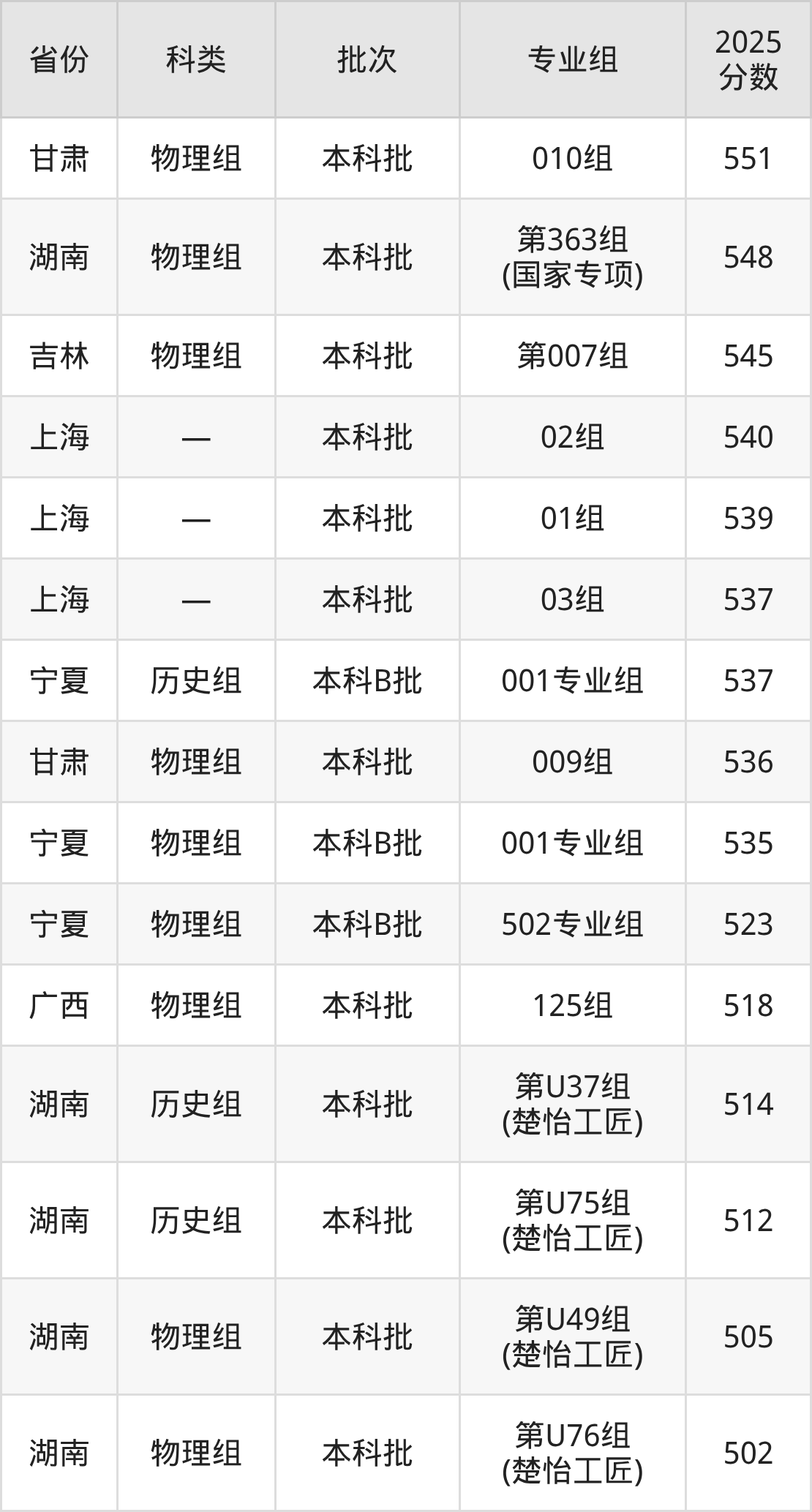 2025年湖南师范大学在全国普通批次招生的录取分数范围位于502~711分之间,其中省内分数范围为502分~606分,物理组最低分专业组为“第U76组(楚怡工匠)”,考生502分即可报考,历史组最低分专业组为“第U75组(楚怡工匠)”,考生512分即可报考。