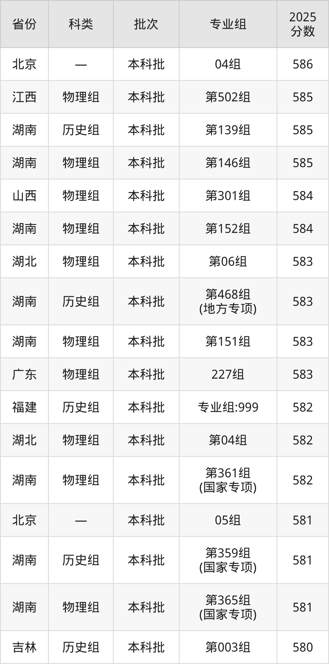 下面是湖南师范大学2025年在全国各省的录取分数线一览表,供参考: