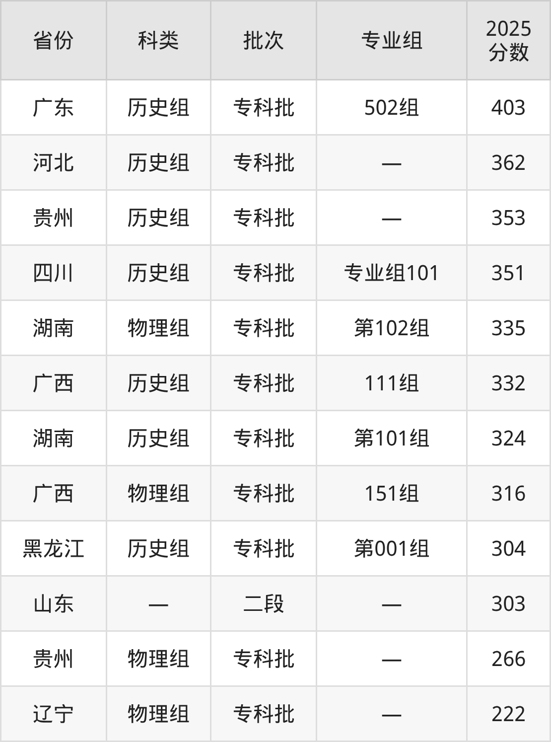 而广东地区历史组考生的分数门槛最高,2025年北海职业学院502组在广东招生最低分为403分,考生至少要超专科线188分才有可能被录取。