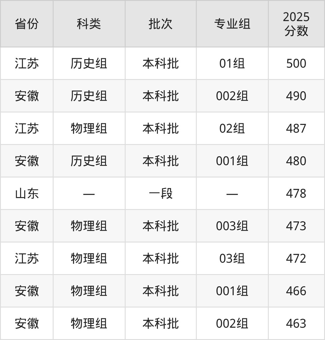 2025年安徽三联学院在全国普通批次招生的录取分数范围位于463~500分之间,其中省内分数范围为463分~490分,历史组最低分专业组为“001组”,考生480分即可报考,物理组最低分专业组为“002组”,考生463分即可报考。