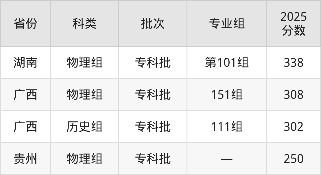 而湖南地区物理组考生的分数门槛最高,2025年广西智能制造职业技术学院第101组在湖南招生最低分为338分,考生至少要超专科线138分才有可能被录取。