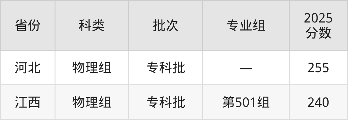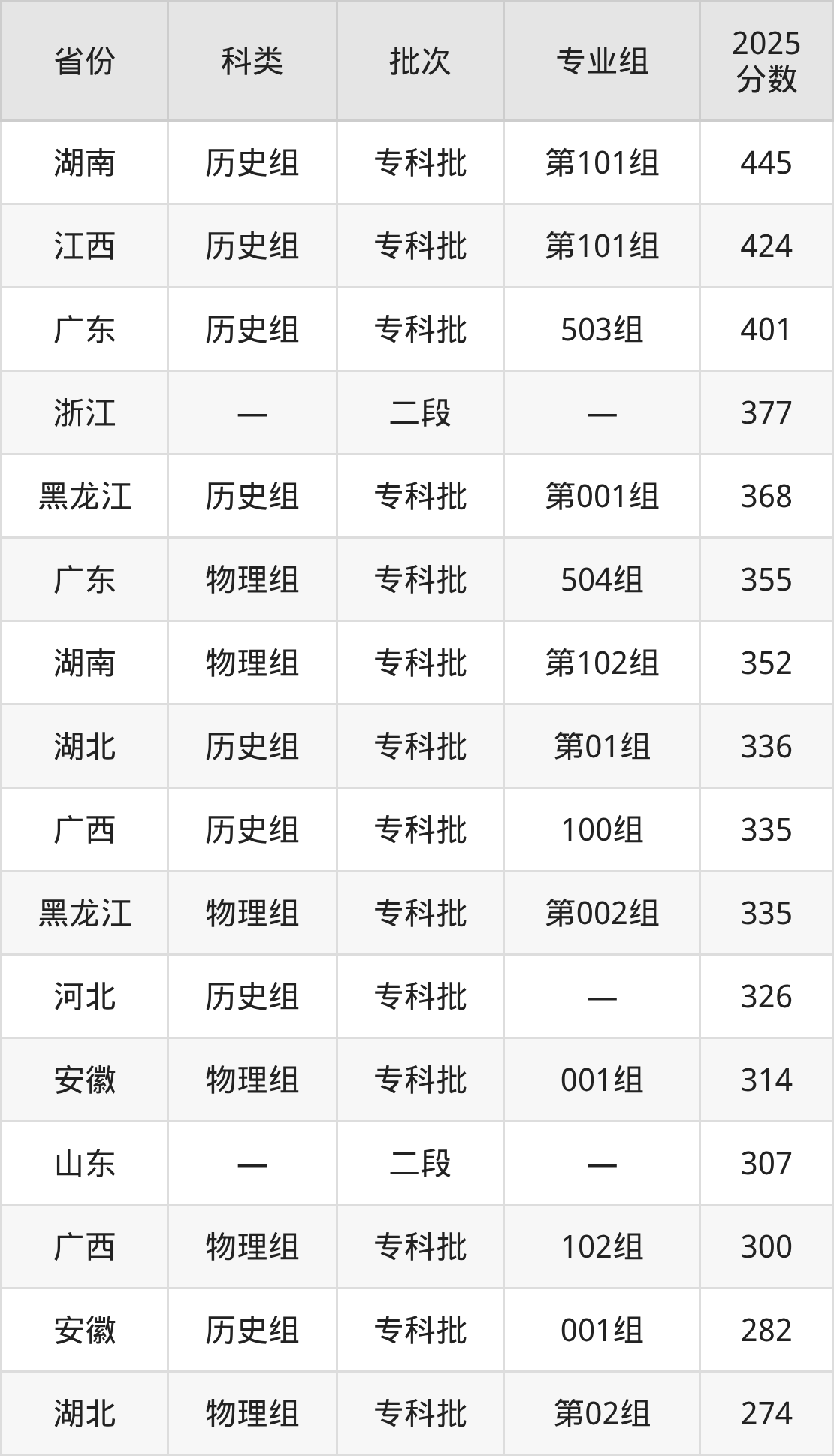 而湖南地区历史组考生的分数门槛最高,2025年厦门安防科技职业学院第101组在湖南招生最低分为445分,考生至少要超专科线245分才有可能被录取。