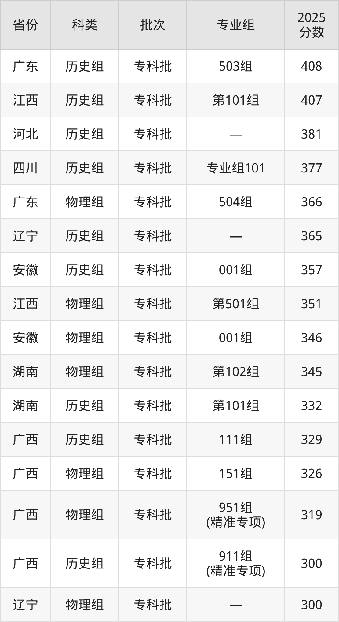 而广东地区历史组考生的分数门槛最高,2025年广西生态工程职业技术学院503组在广东招生最低分为408分,考生至少要超专科线193分才有可能被录取。