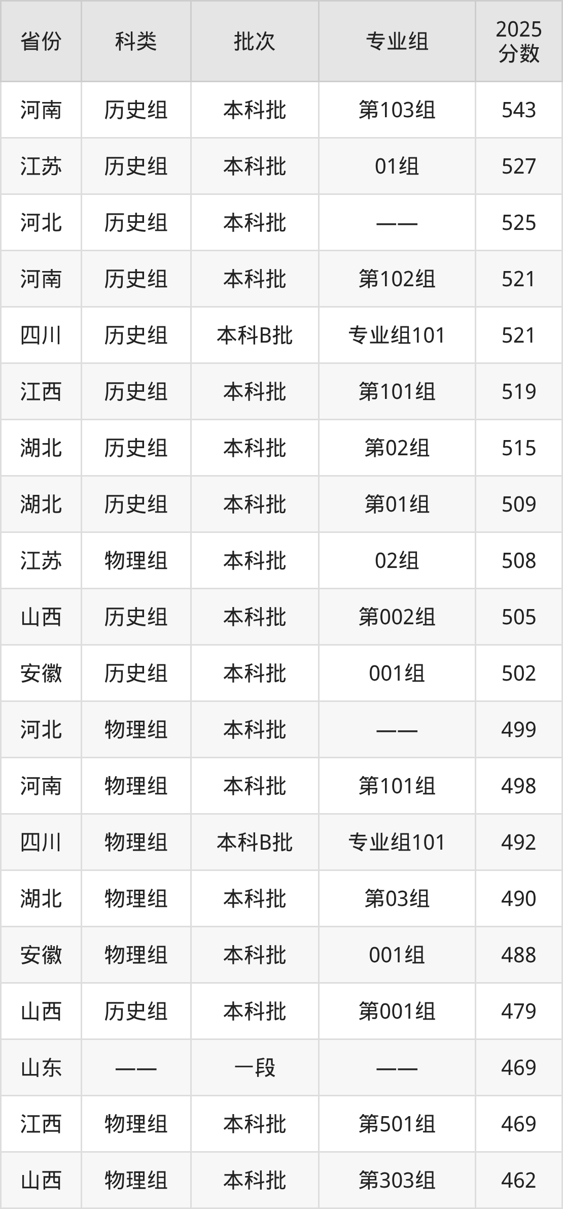 2025年山西工程科技职业大学在全国普通批次招生的录取分数范围位于346~543分之间,其中省内分数范围为383分~505分,历史组最低分专业组为“第003组”,考生403分即可报考,物理组最低分专业组为“第307组”,考生383分即可报考。