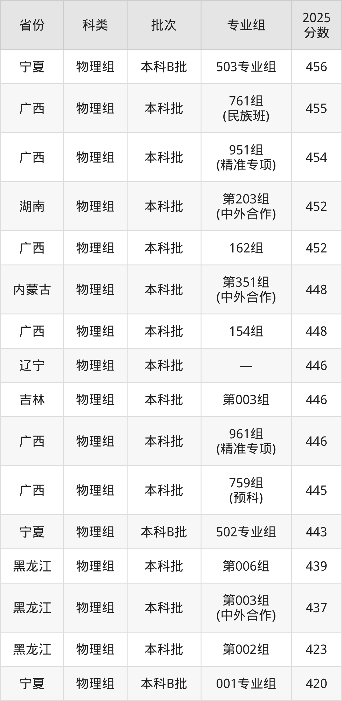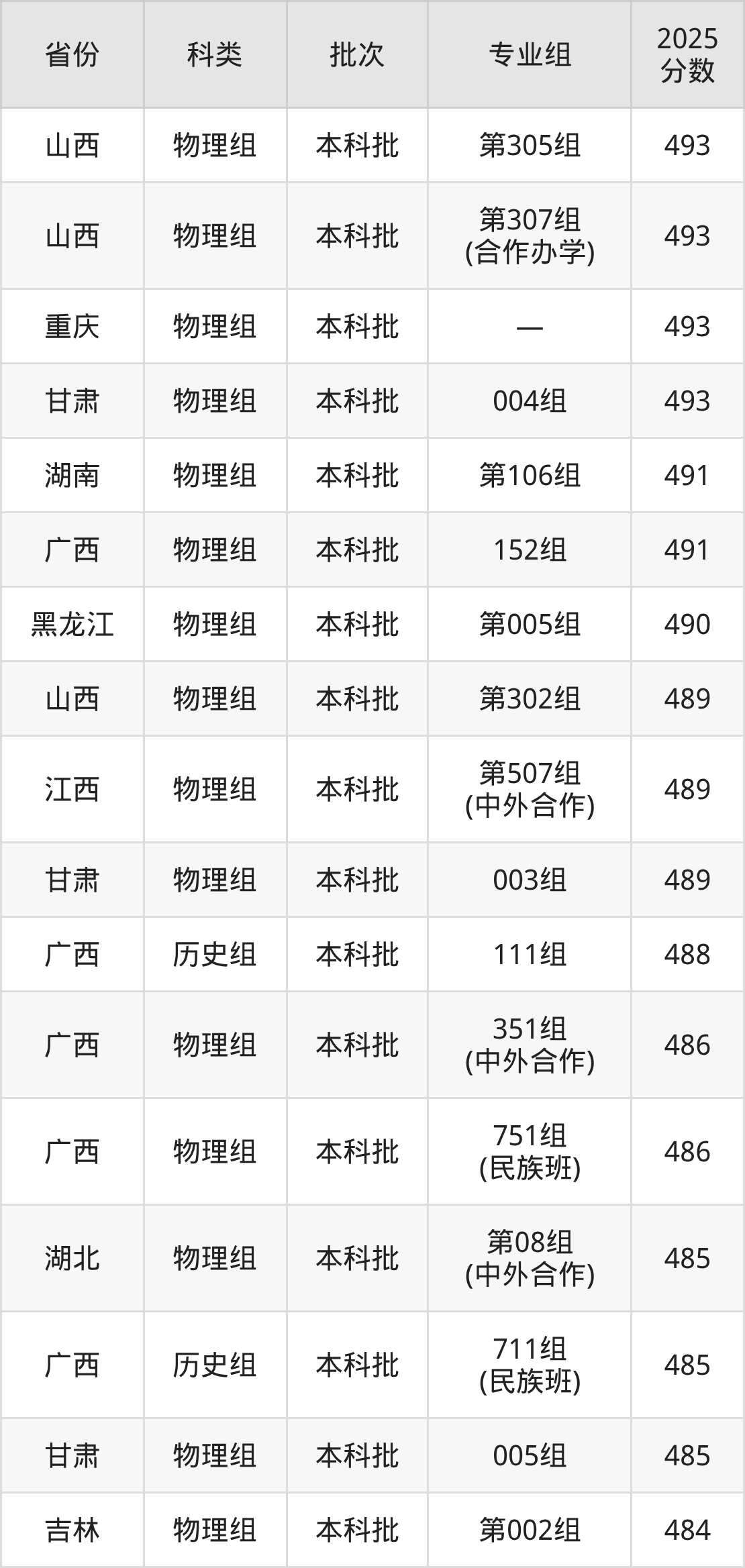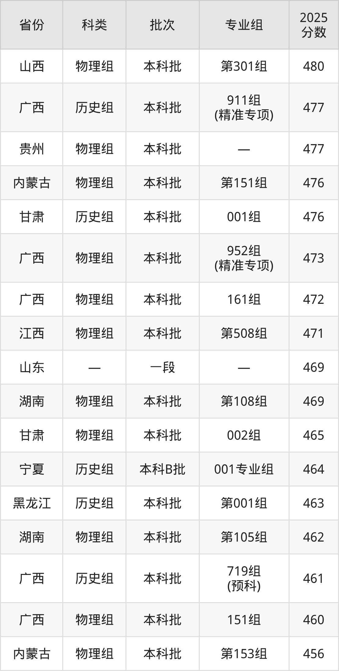 2025年广西科技大学在全国普通批次招生的录取分数范围位于420~590分之间,其中壮族自治区内分数范围为445分~498分,物理组最低分专业组为“759组(预科)”,考生445分即可报考,历史组最低分专业组为“719组(预科)”,考生461分即可报考。