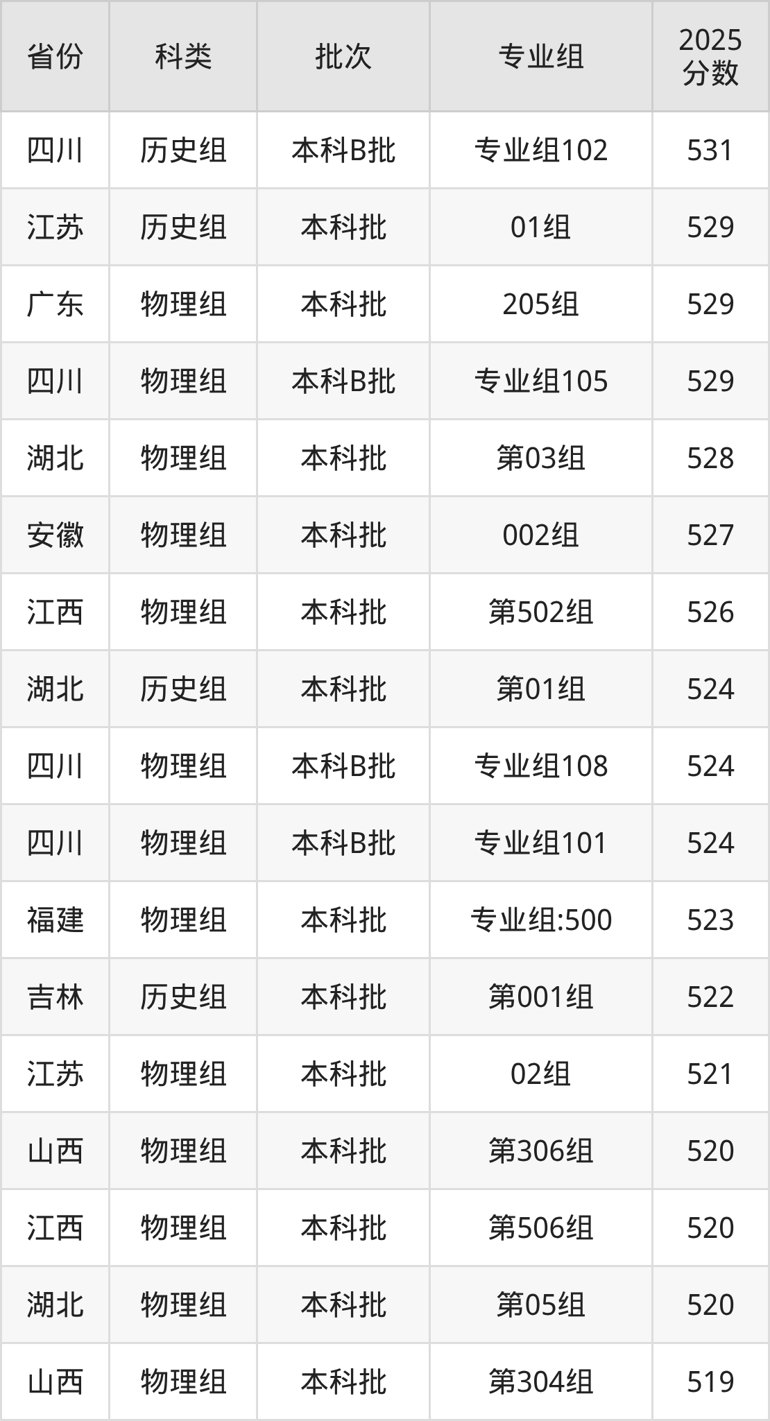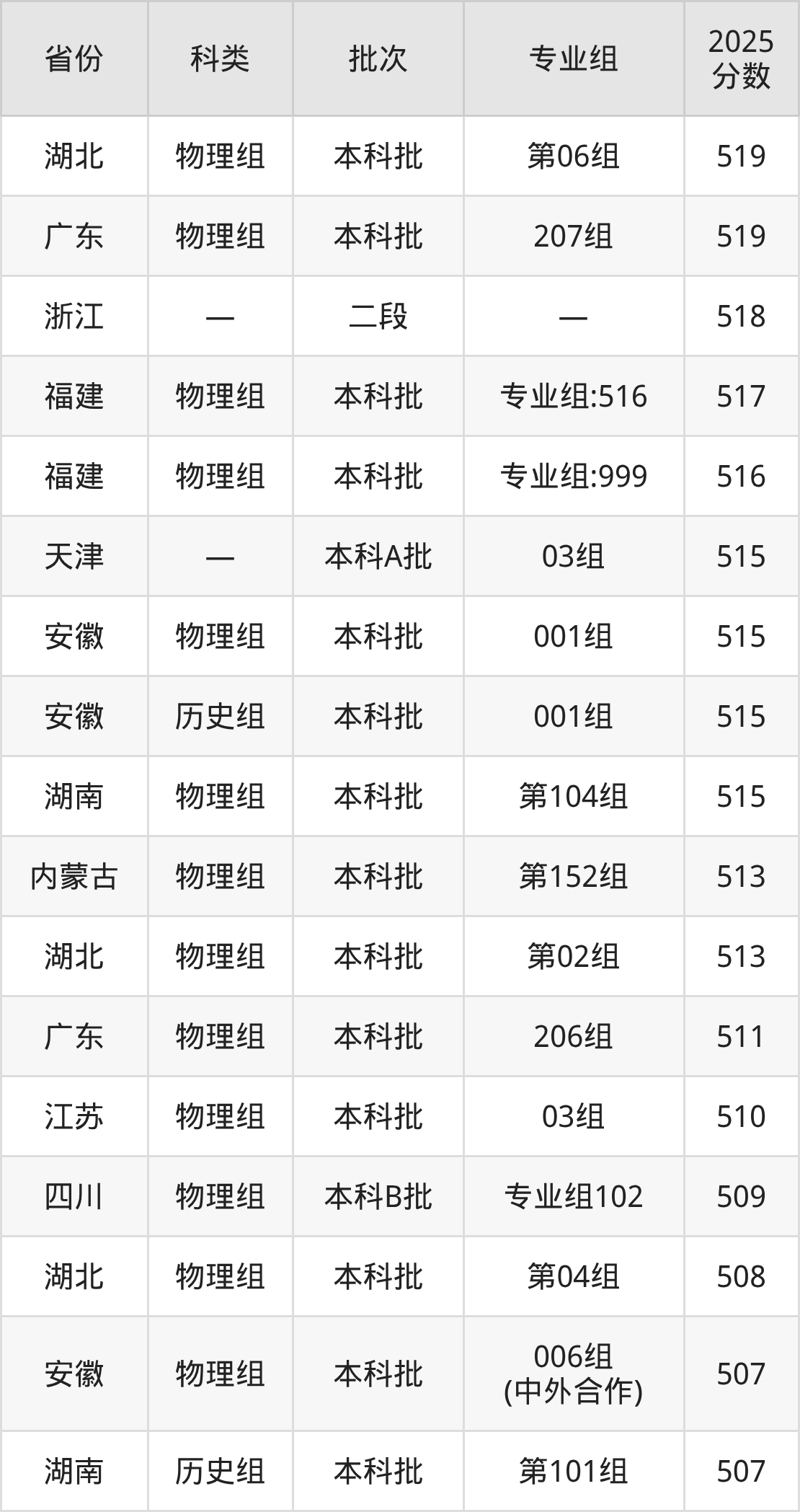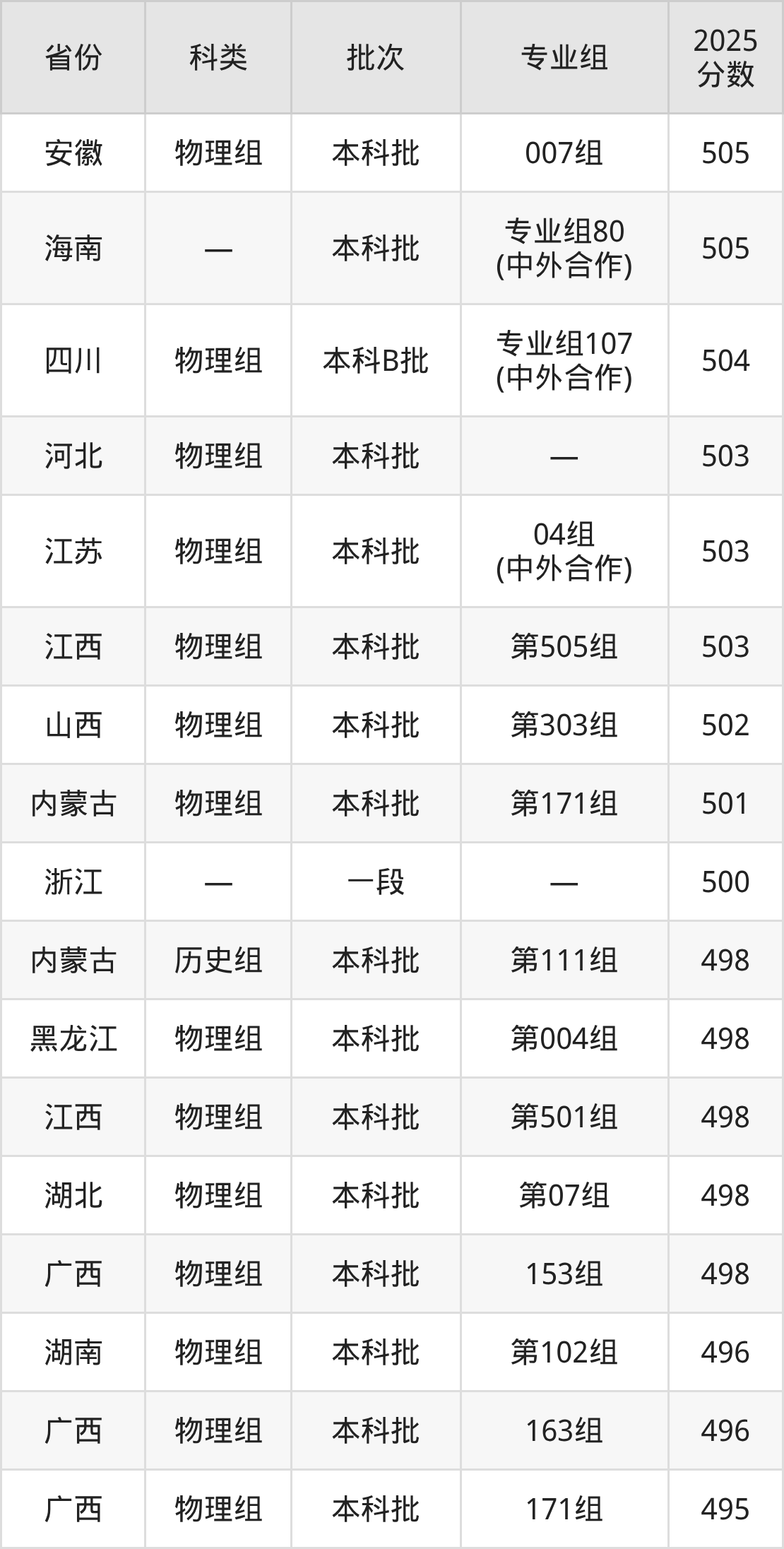 2025年广西科技大学在全国普通批次招生的录取分数范围位于420~590分之间,其中壮族自治区内分数范围为445分~498分,物理组最低分专业组为“759组(预科)”,考生445分即可报考,历史组最低分专业组为“719组(预科)”,考生461分即可报考。