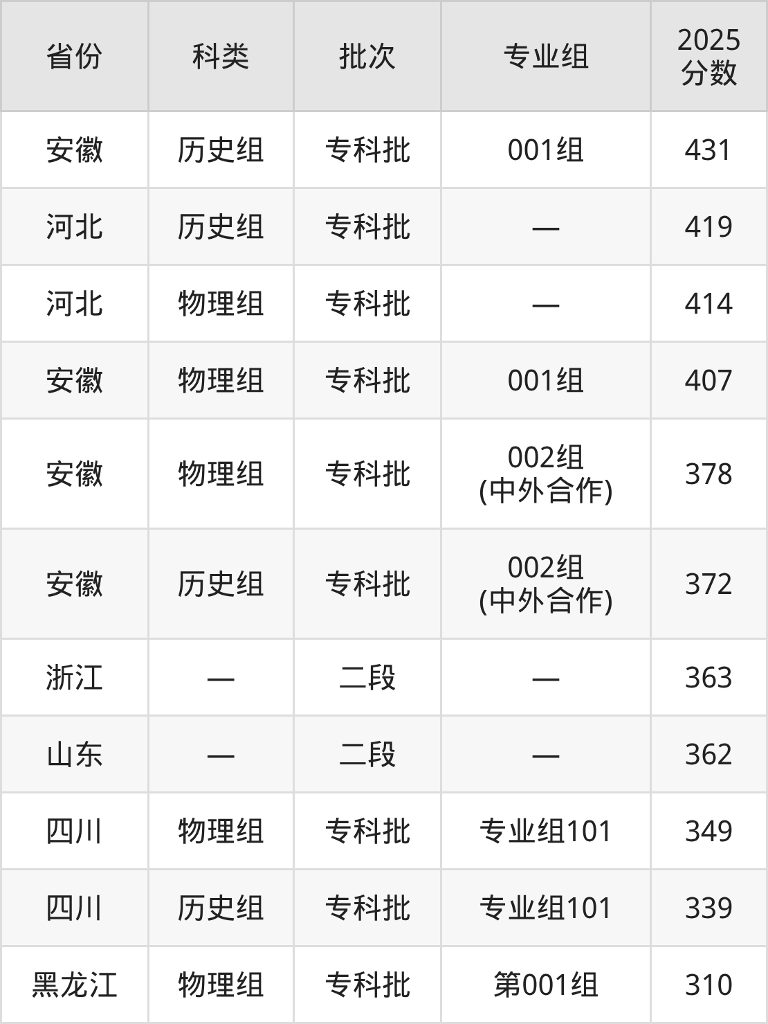 而河北地区历史组考生的分数门槛最高,2025年安徽财贸职业学院在河北招生最低分为419分,考生至少要超专科线219分才有可能被录取。
