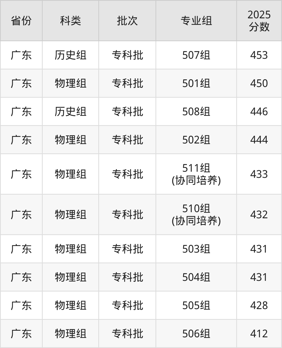 2025年佛山职业技术学院在全国普通批次招生的录取分数范围位于412~453分之间,其中省内分数范围为412分~453分,历史组最低分专业组为“508组”,考生446分即可报考,物理组最低分专业组为“506组”,考生412分即可报考。