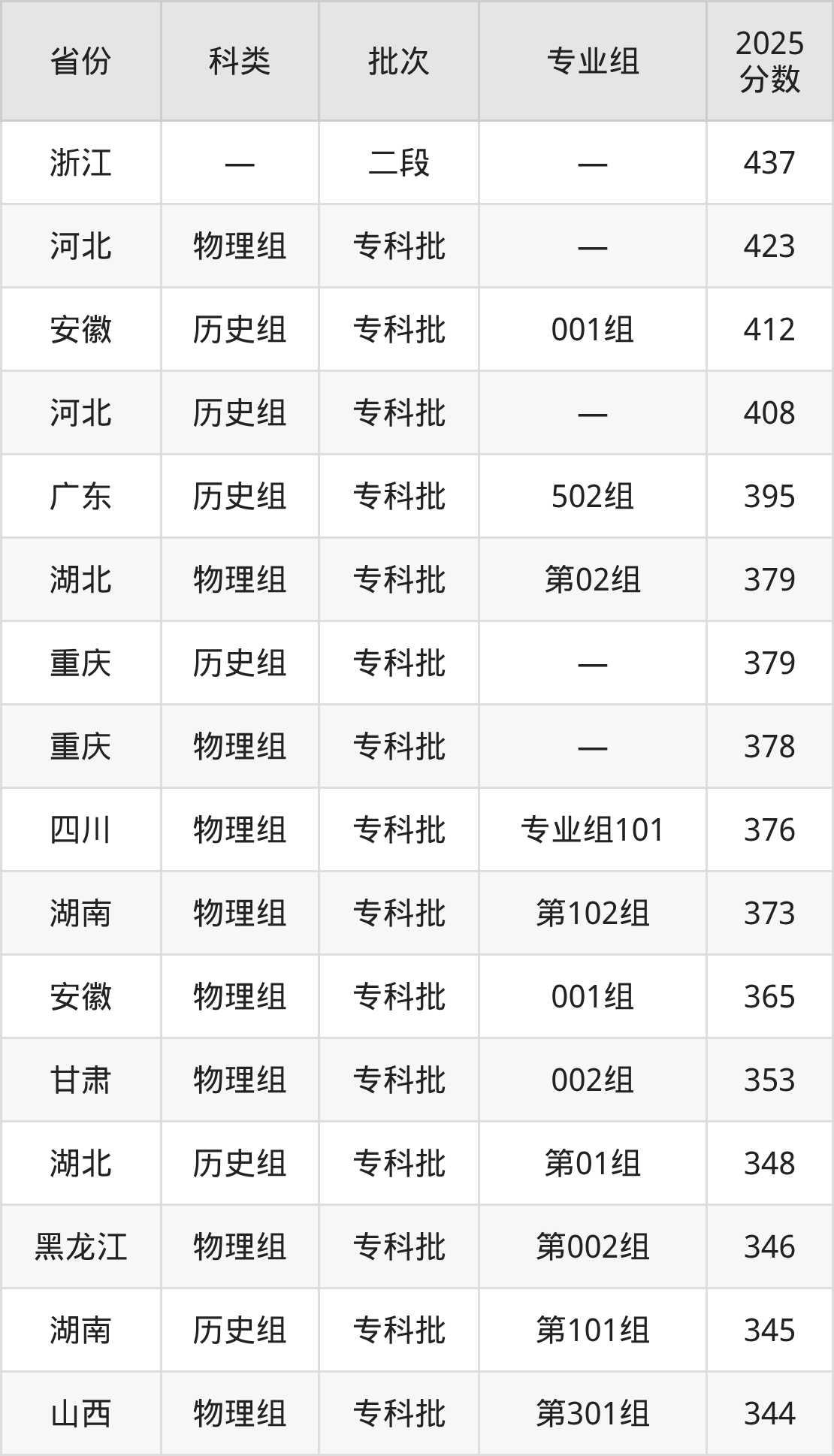 而浙江地区考生的分数门槛最高,2025年宣城职业技术学院在浙江招生最低分为437分,考生至少要超二段线169分才有可能被录取。