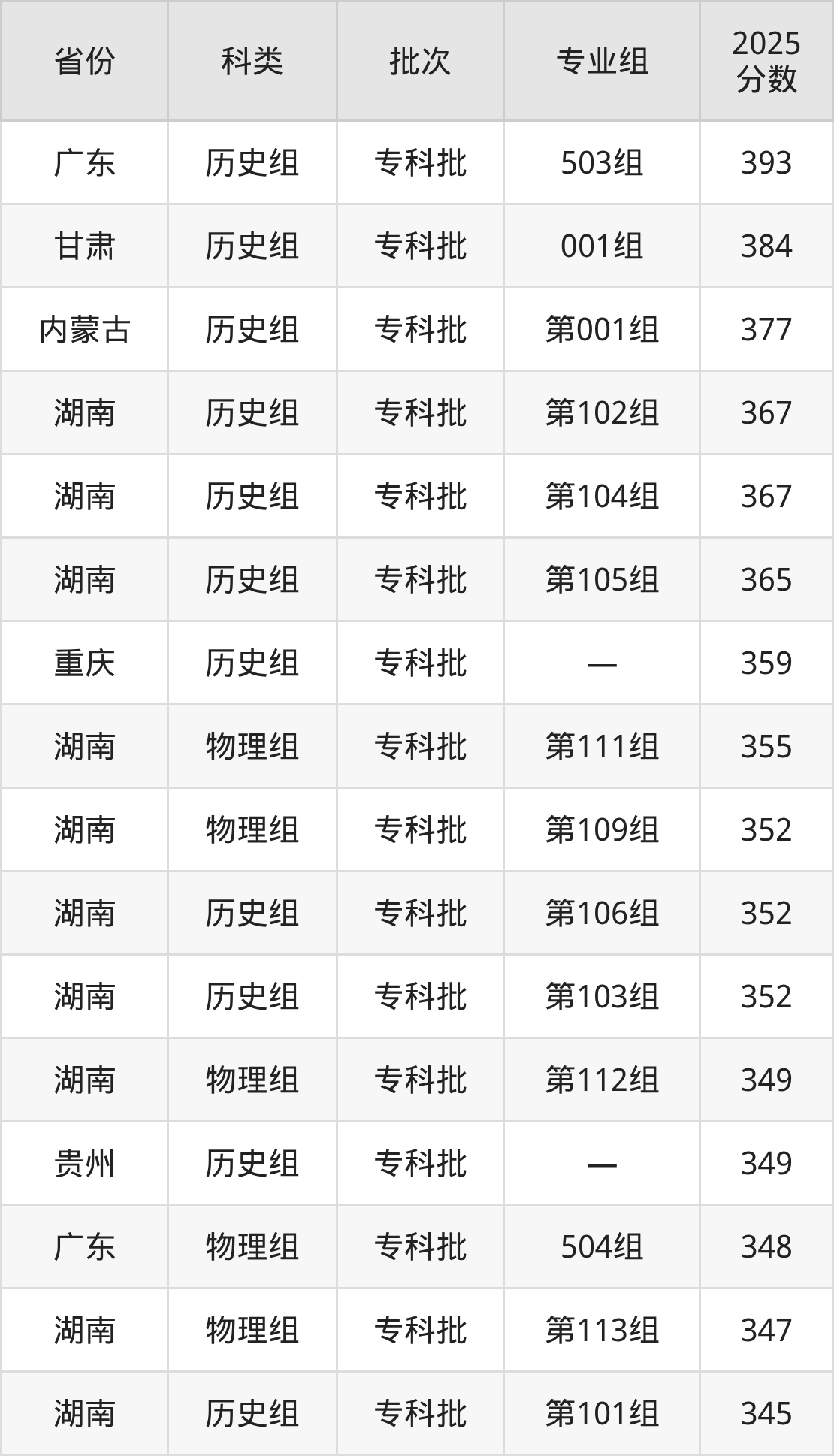 而广东地区历史组考生的分数门槛最高,2025年湖南民族职业学院503组在广东招生最低分为393分,考生至少要超专科线178分才有可能被录取。