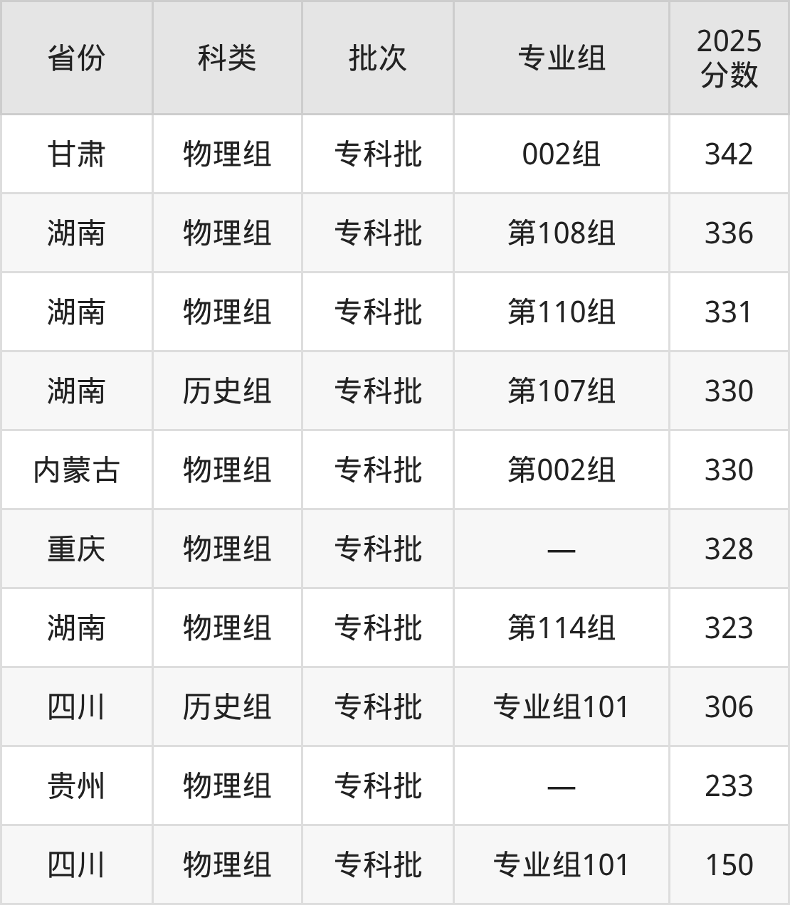 2025年湖南民族职业学院在全国普通批次招生的录取分数范围位于150~393分之间,其中省内分数范围为323分~367分,历史组最低分专业组为“第107组”,考生330分即可报考,物理组最低分专业组为“第114组”,考生323分即可报考。