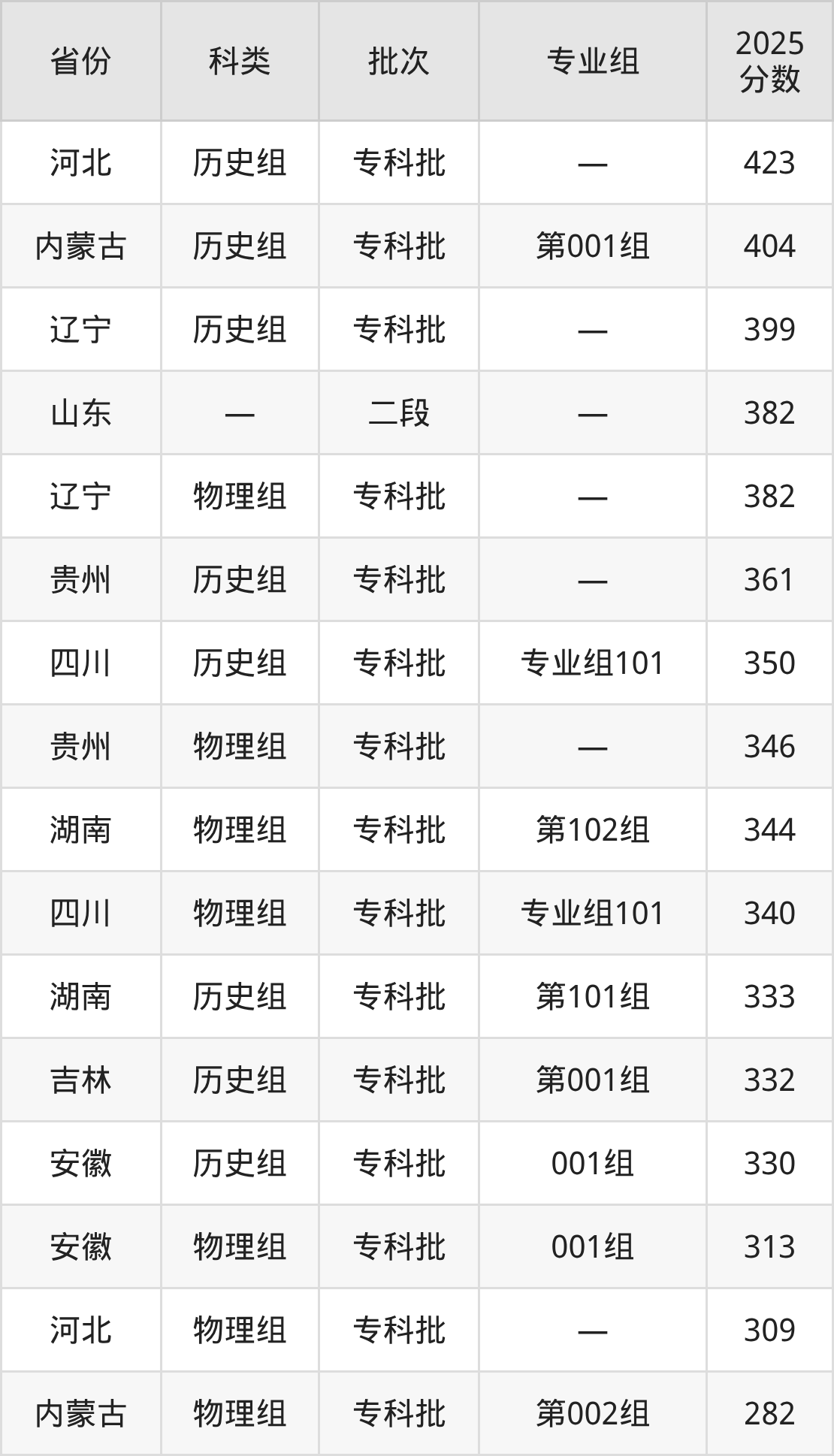 而河北地区历史组考生的分数门槛最高,2025年长白山职业技术学院在河北招生最低分为423分,考生至少要超专科线223分才有可能被录取。