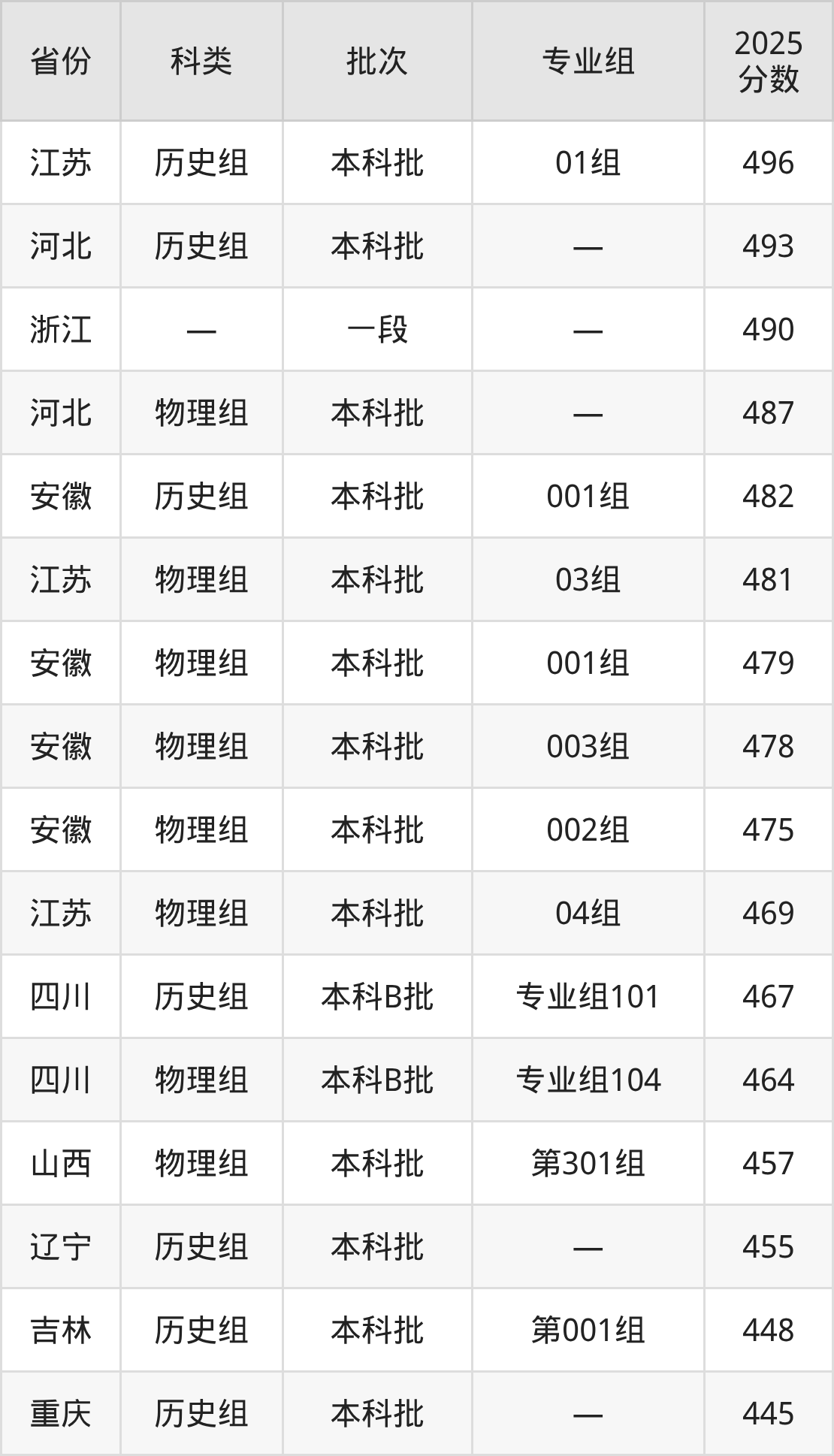 而江苏地区历史组考生的分数门槛最高,2025年山东现代学院01组在江苏招生最低分为496分,考生至少要超本科线14分才有可能被录取。