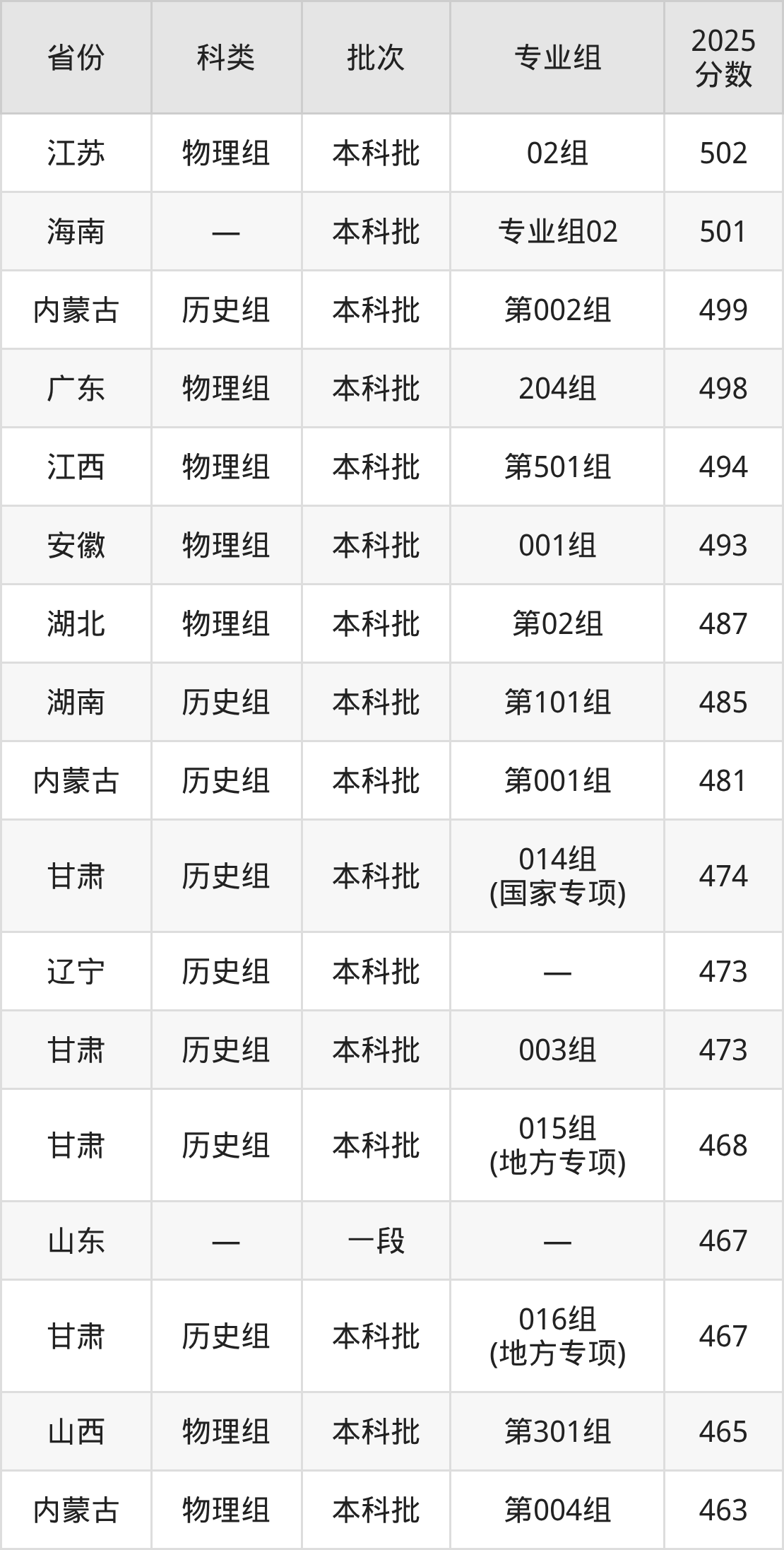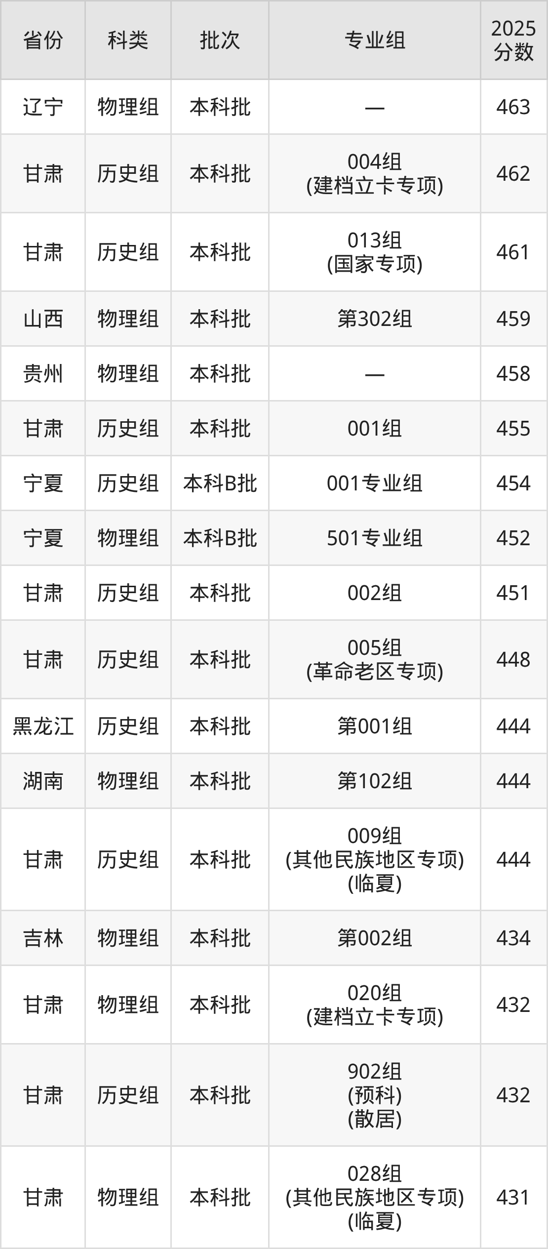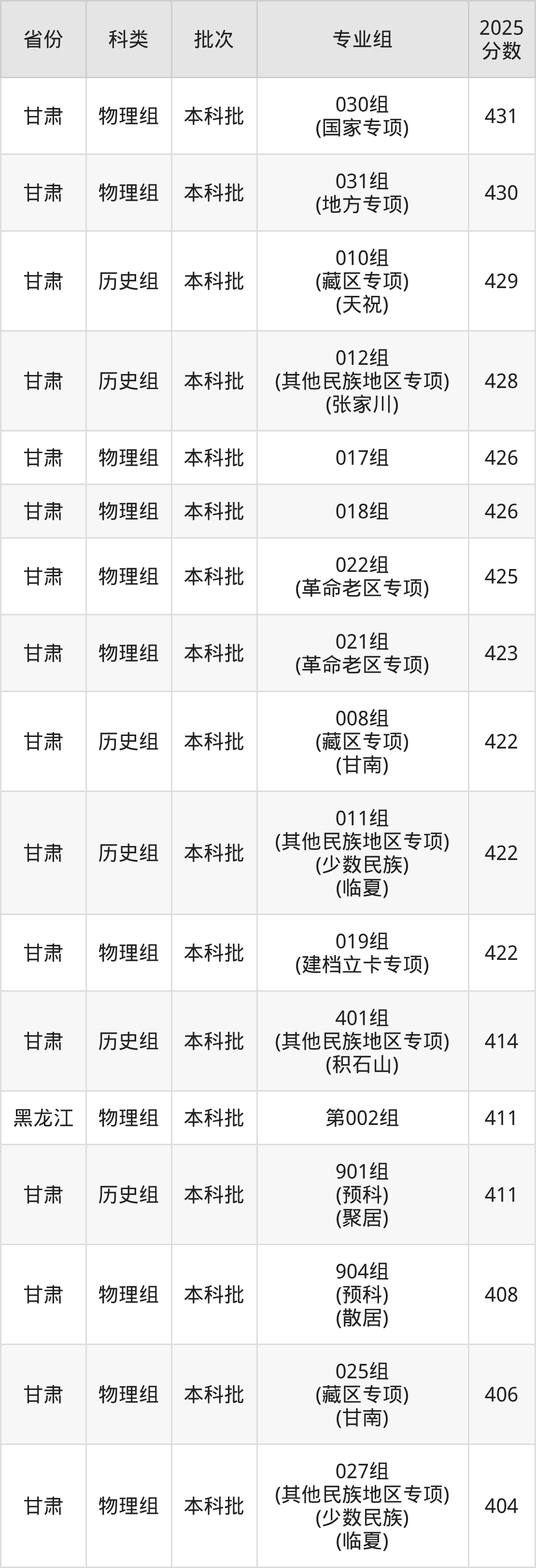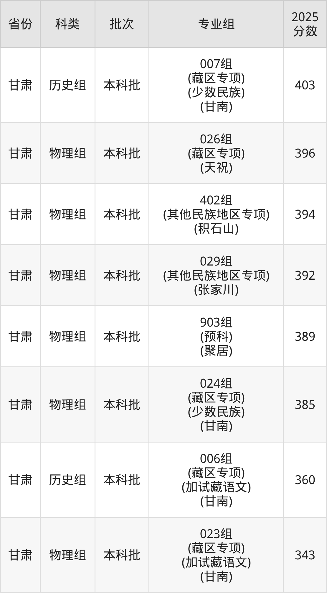 2025年兰州文理学院在全国普通批次招生的录取分数范围位于343~567分之间,其中省内分数范围为343分~474分,历史组最低分专业组为“006组(藏区专项)(加试藏语文)(甘南)”,考生360分即可报考,物理组最低分专业组为“023组(藏区专项)(加试藏语文)(甘南)”,考生343分即可报考。
