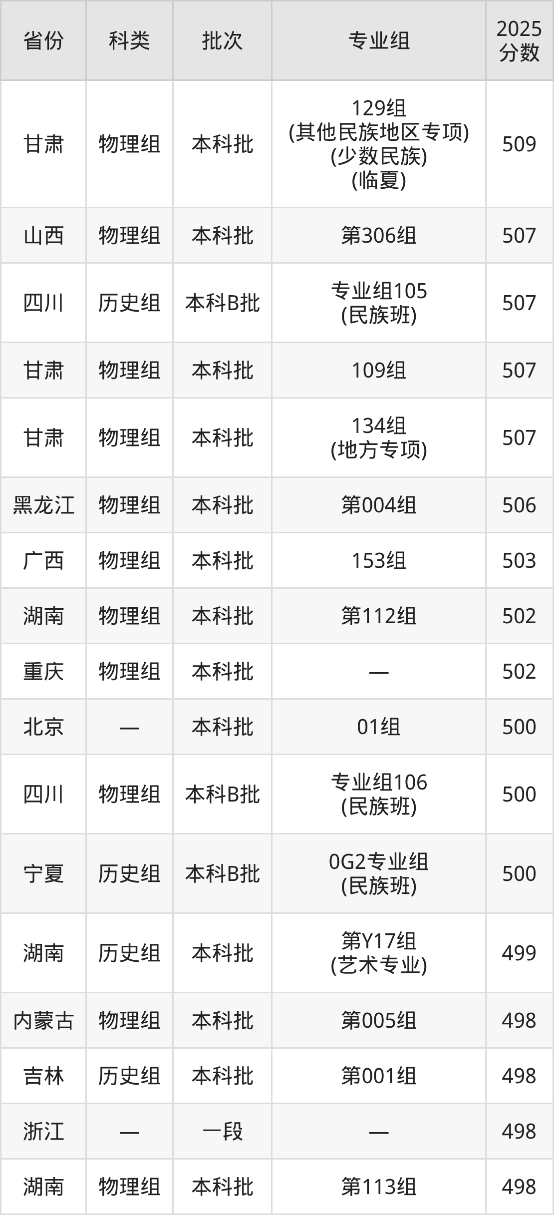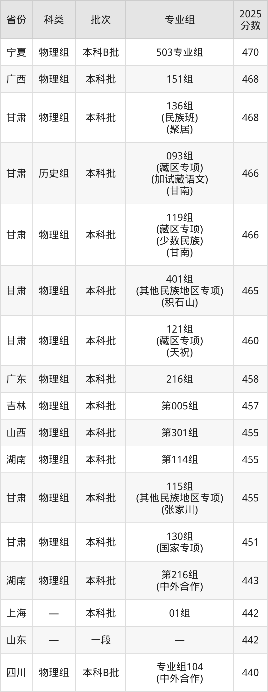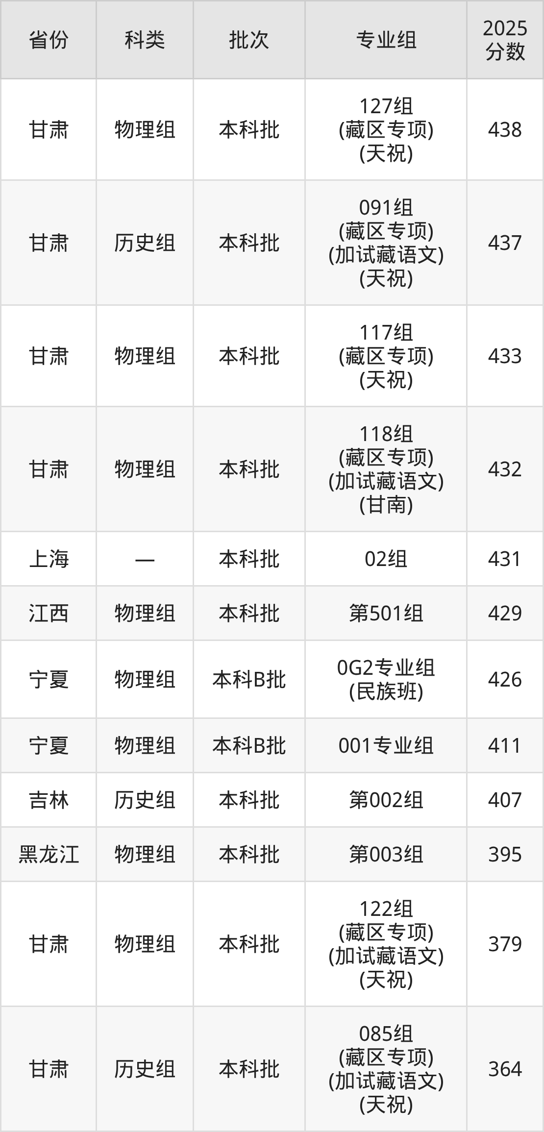 2025年西北师范大学在全国普通批次招生的录取分数范围位于364~638分之间,其中省内分数范围为364分~561分,历史组最低分专业组为“085组(藏区专项)(加试藏语文)(天祝)”,考生364分即可报考,物理组最低分专业组为“122组(藏区专项)(加试藏语文)(天祝)”,考生379分即可报考。