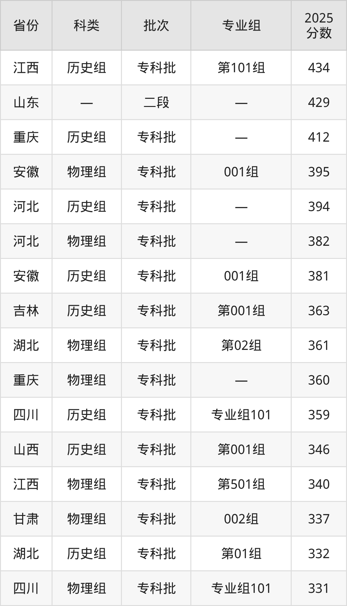 而江西地区历史组考生的分数门槛最高,2025年邯郸职业技术学院第101组在江西招生最低分为434分,考生至少要超专科线144分才有可能被录取。