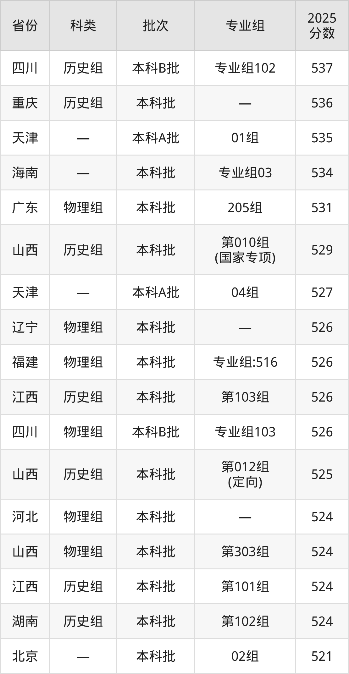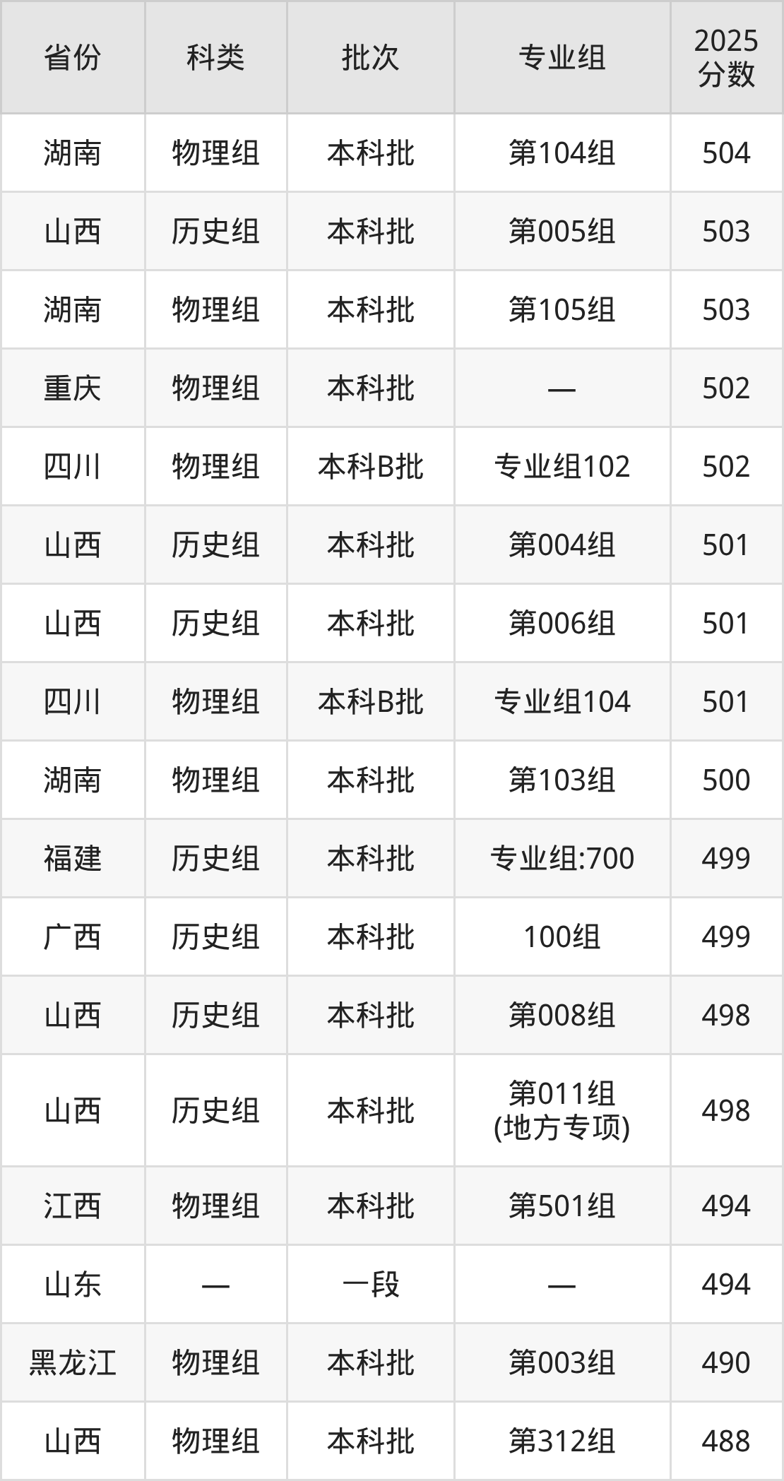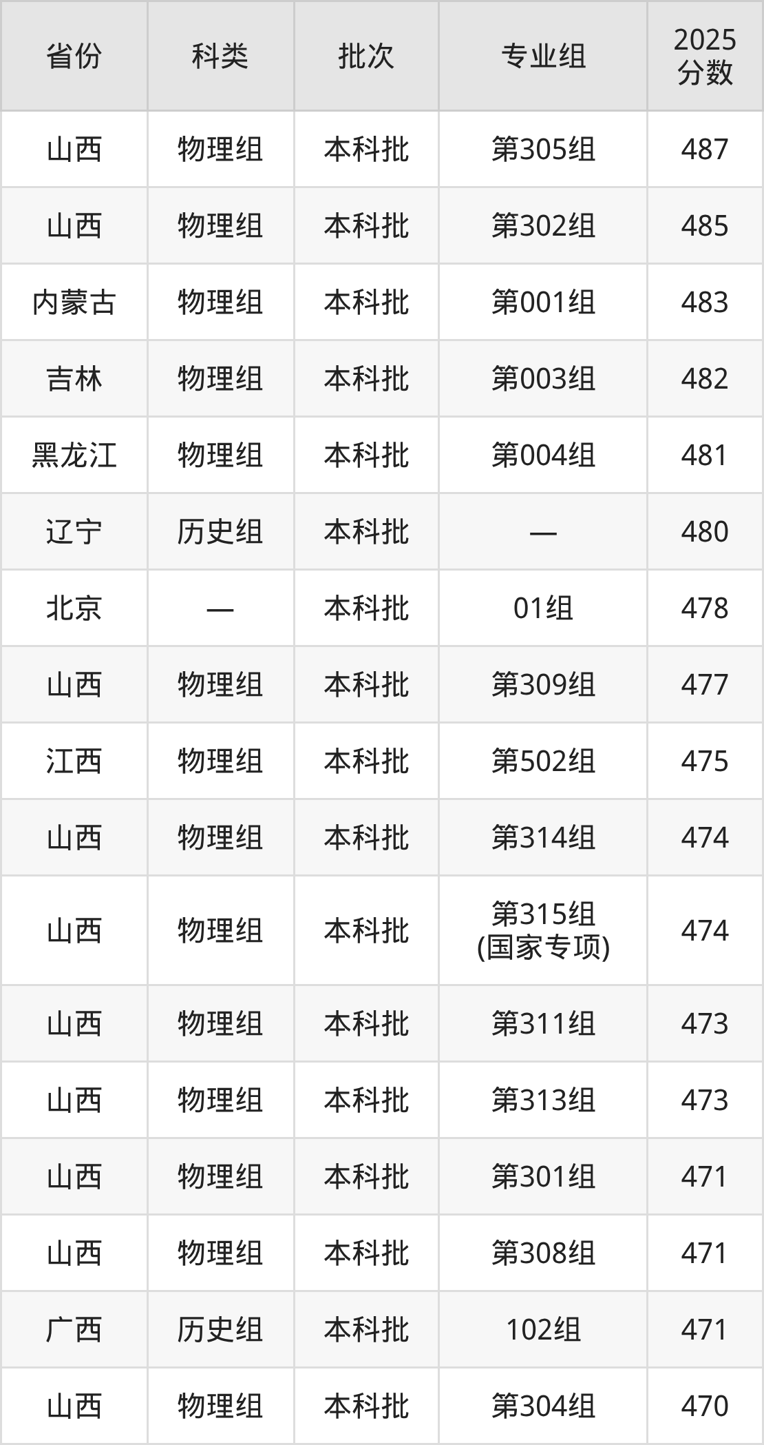 2025年山西大同大学在全国普通批次招生的录取分数范围位于418~572分之间,其中省内分数范围为465分~543分,物理组最低分专业组为“第316组(地方专项)”,考生465分即可报考,历史组最低分专业组为“第007组”,考生468分即可报考。