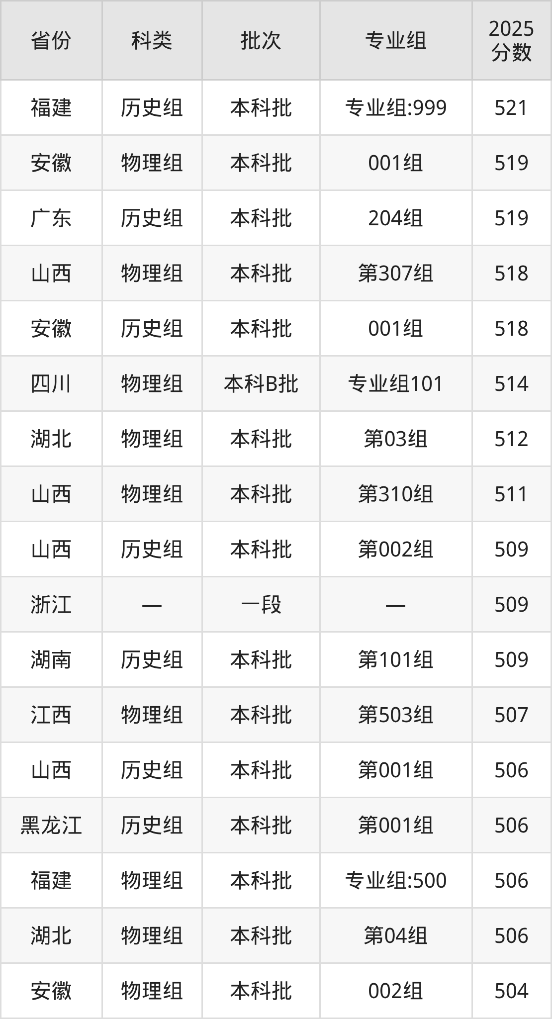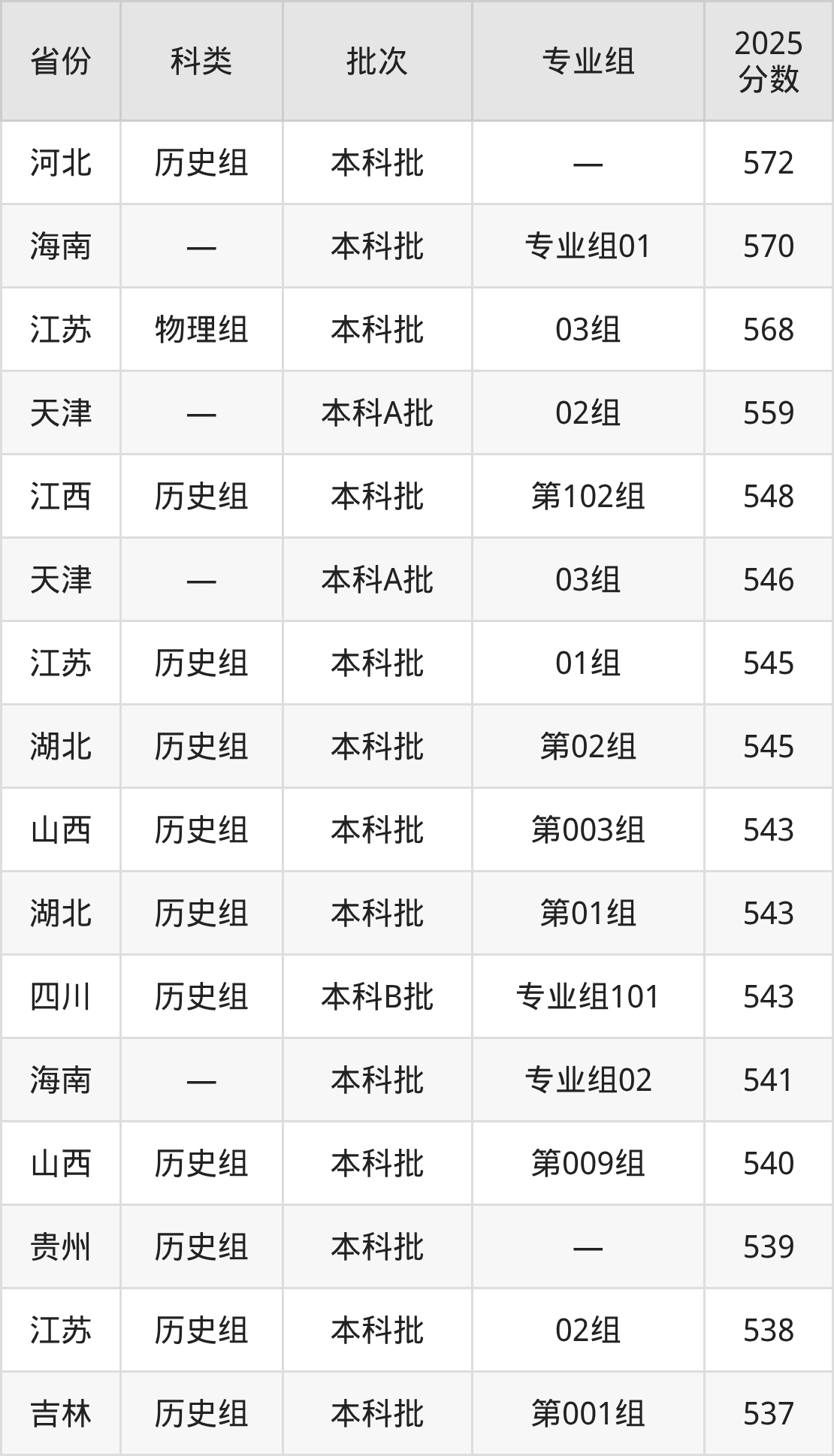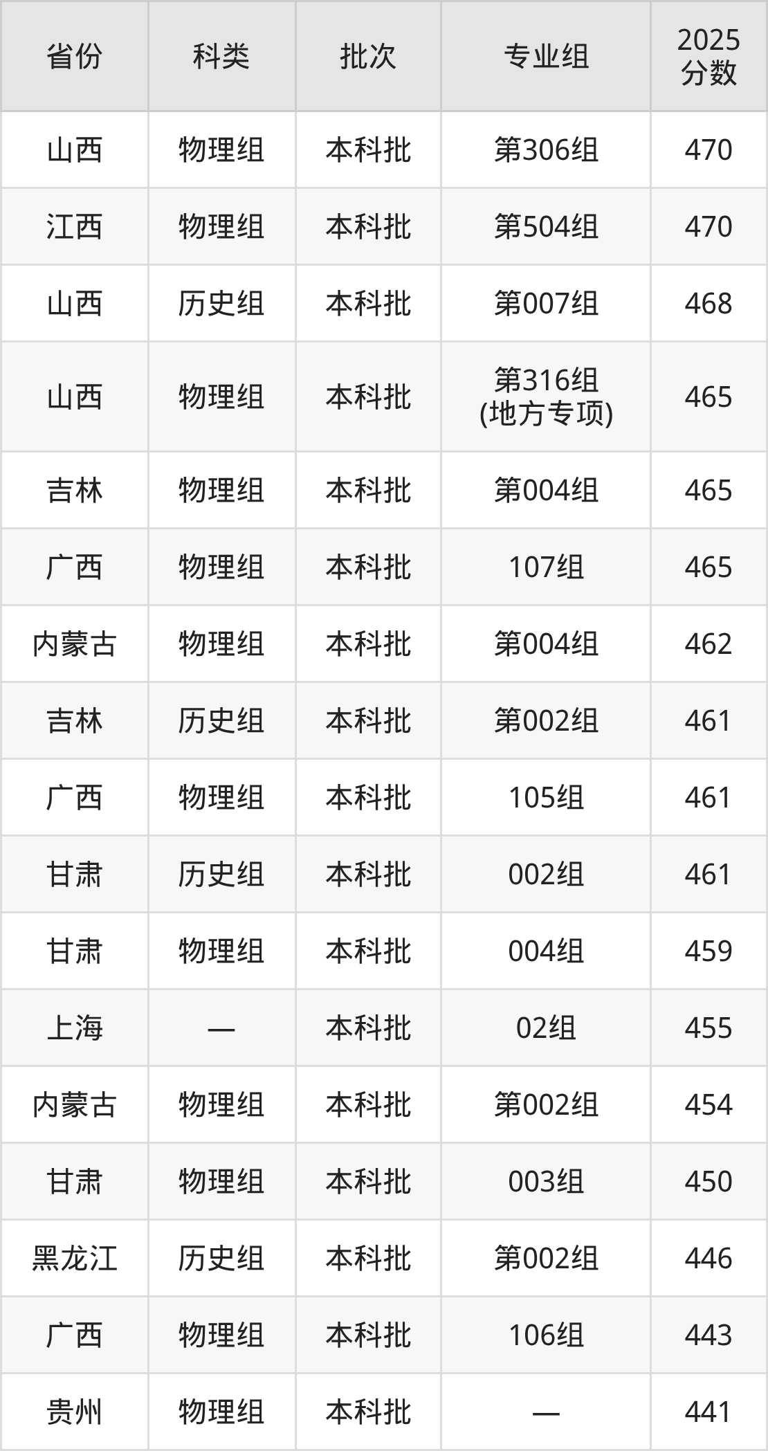 2025年山西大同大学在全国普通批次招生的录取分数范围位于418~572分之间,其中省内分数范围为465分~543分,物理组最低分专业组为“第316组(地方专项)”,考生465分即可报考,历史组最低分专业组为“第007组”,考生468分即可报考。