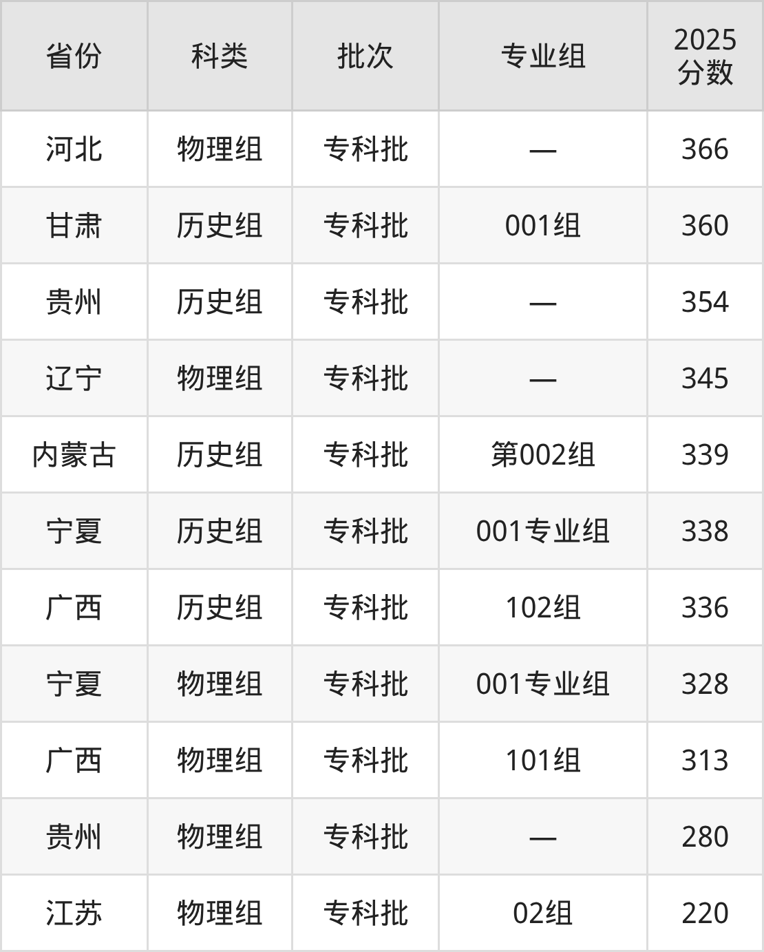 下面是西安职业技术学院2025年在全国各省的录取分数线一览表,供参考: