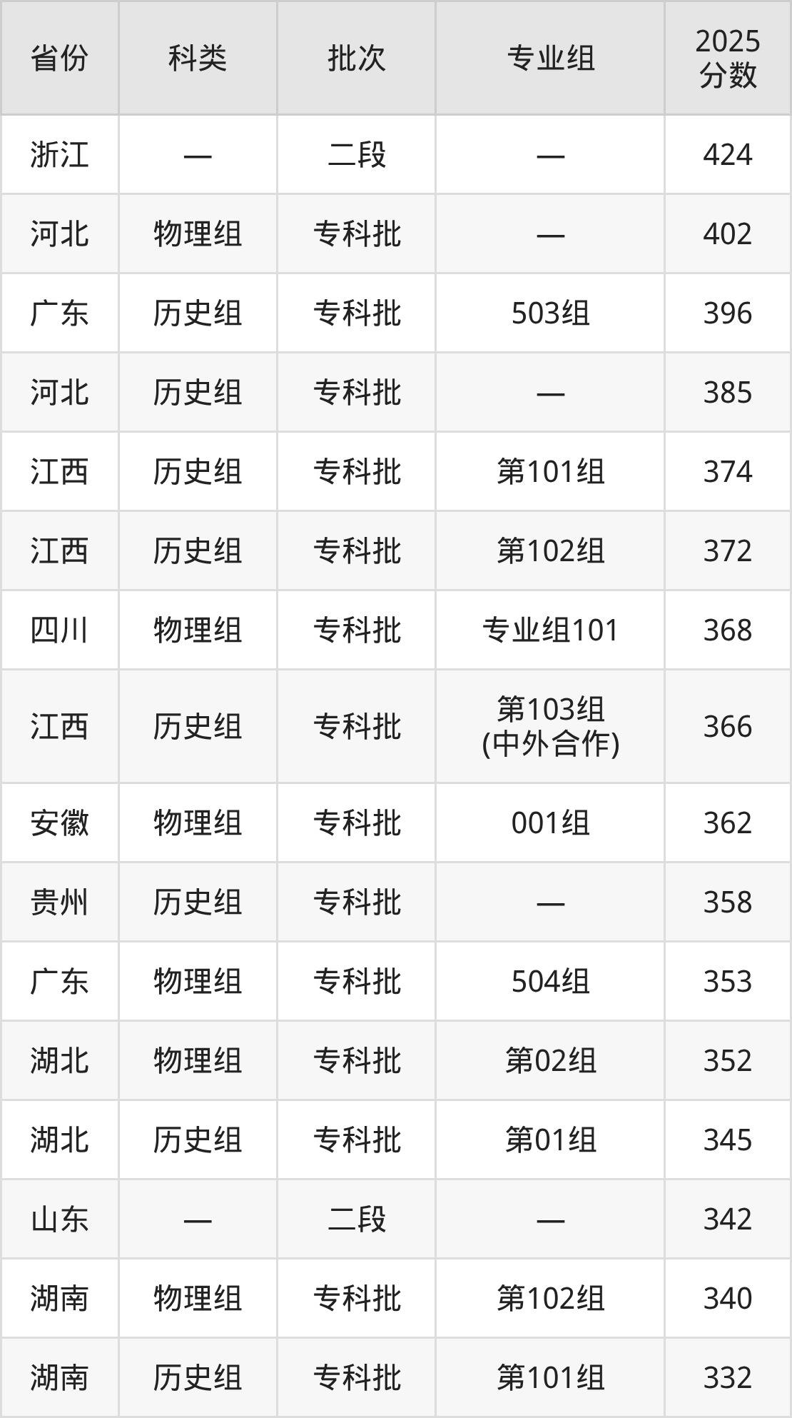 而浙江地区考生的分数门槛最高,2025年上饶职业技术学院在浙江招生最低分为424分,考生至少要超二段线156分才有可能被录取。