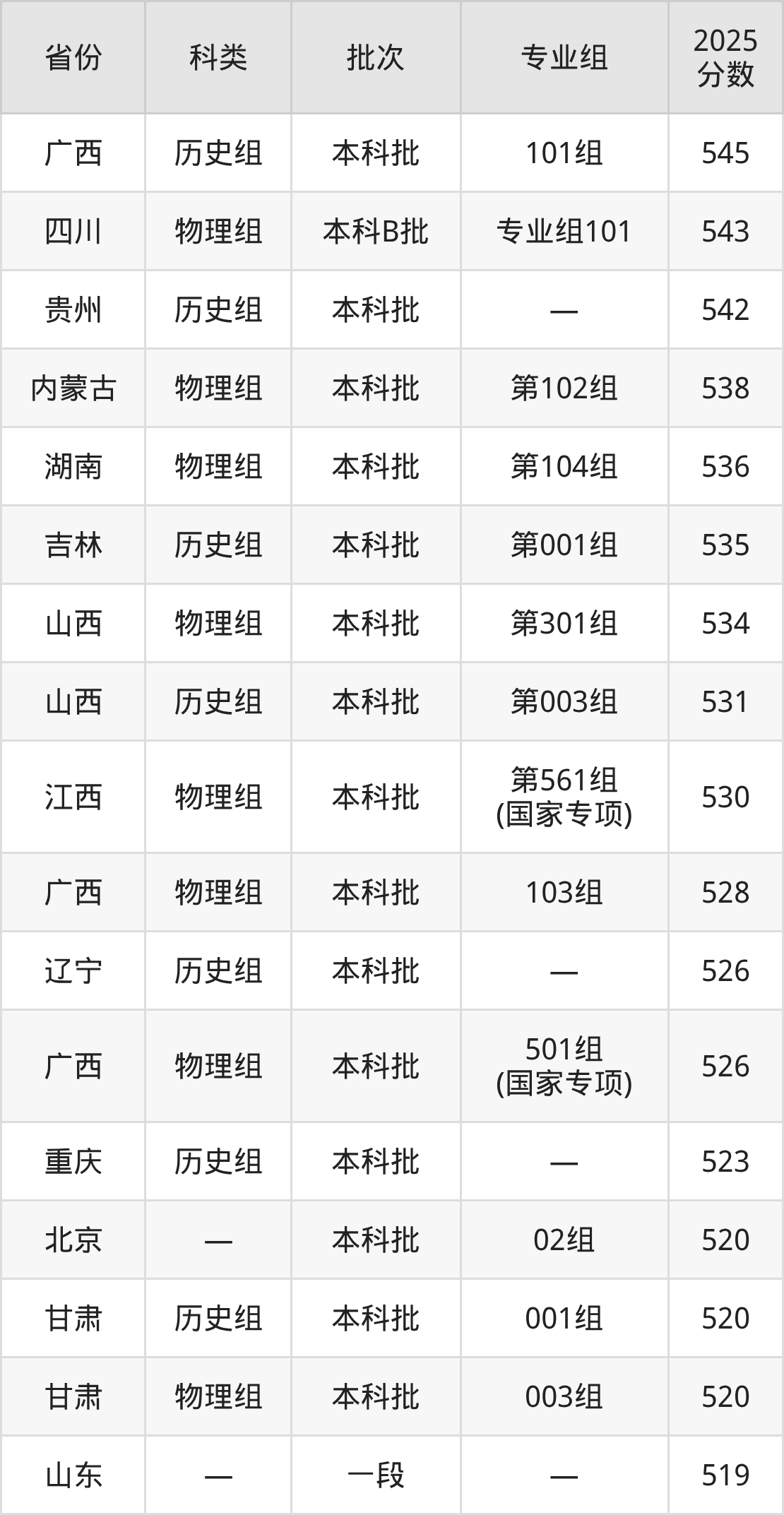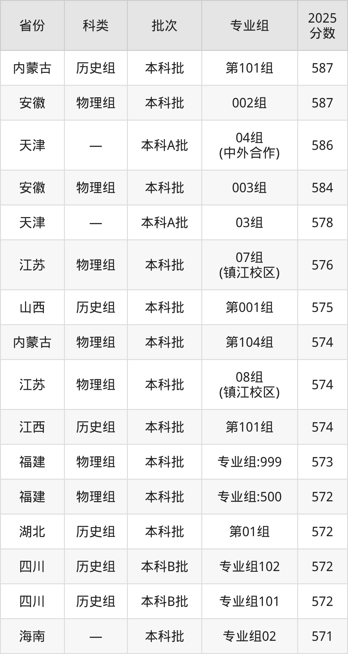 而内蒙古地区历史组考生的分数门槛最高,2025年江苏科技大学第101组在内蒙古招生最低分为587分,考生至少要超本科线169分才有可能被录取。