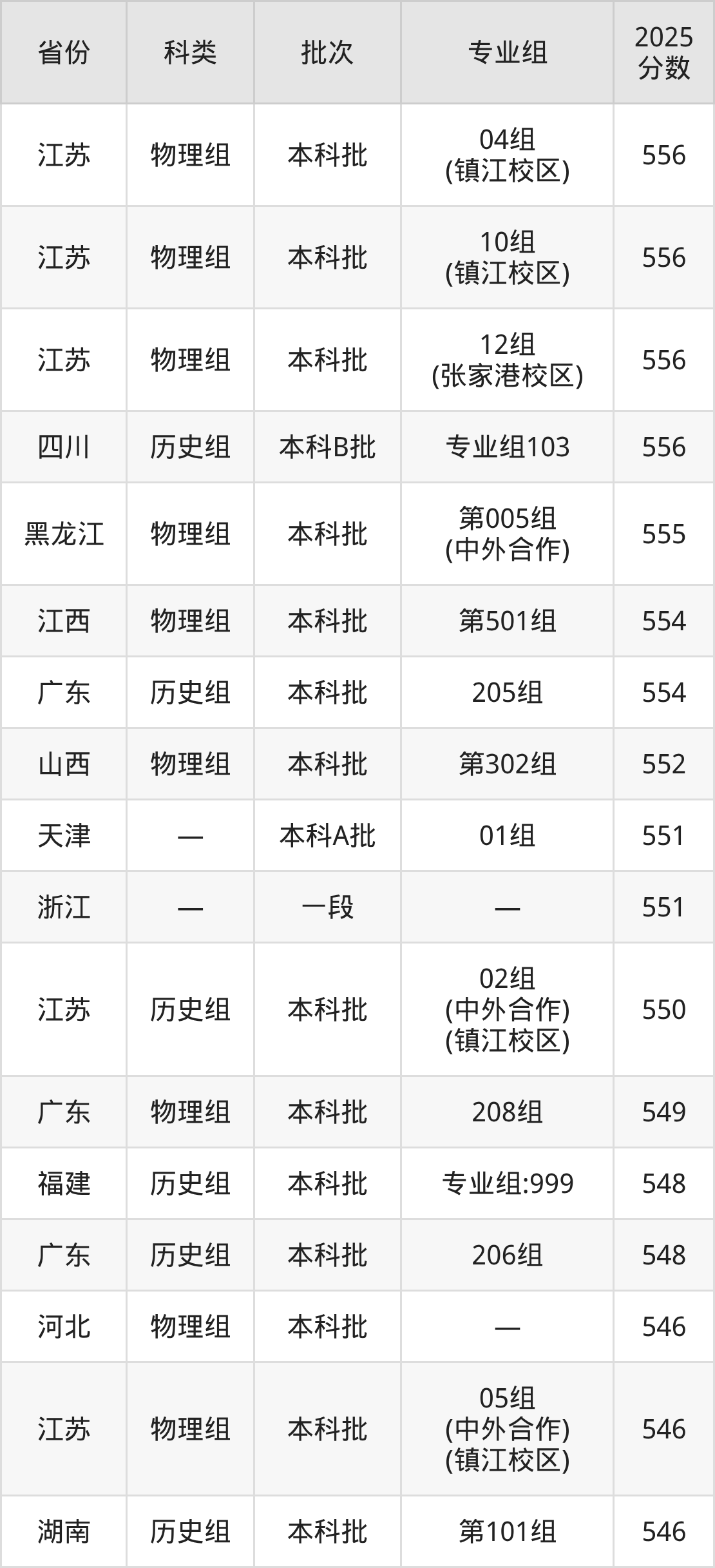 2025年江苏科技大学在全国普通批次招生的录取分数范围位于454~587分之间,其中省内分数范围为546分~576分,物理组最低分专业组为“05组(中外合作)(镇江校区)”,考生546分即可报考,历史组最低分专业组为“02组(中外合作)(镇江校区)”,考生550分即可报考。