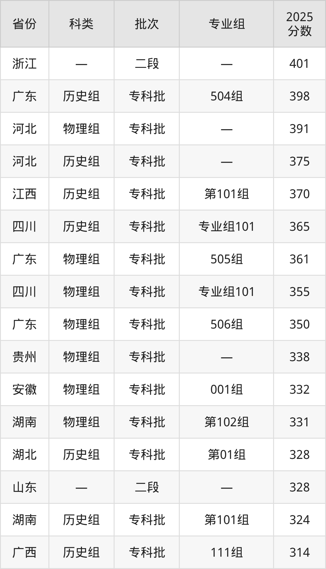 而浙江地区考生的分数门槛最高,2025年广西物流职业技术学院在浙江招生最低分为401分,考生至少要超二段线133分才有可能被录取。