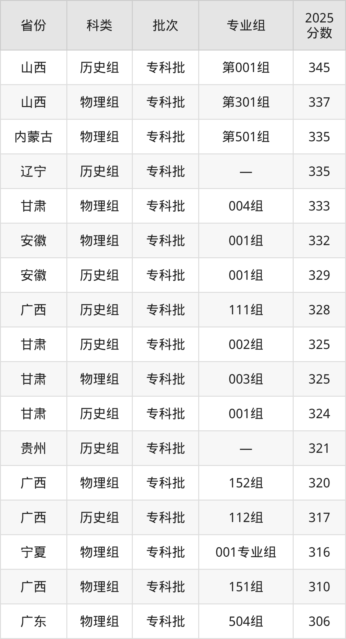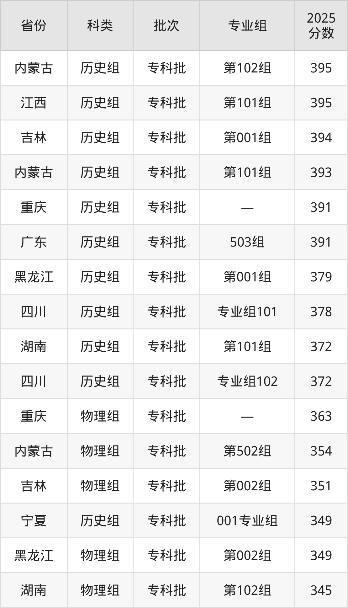 而内蒙古地区历史组考生的分数门槛最高,2025年铁岭卫生职业学院第102组在内蒙古招生最低分为395分,考生至少要超专科线235分才有可能被录取。