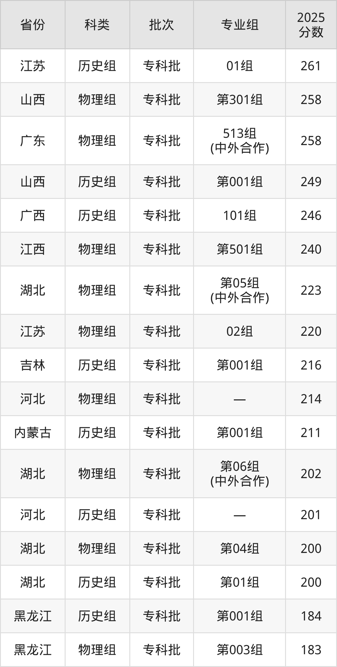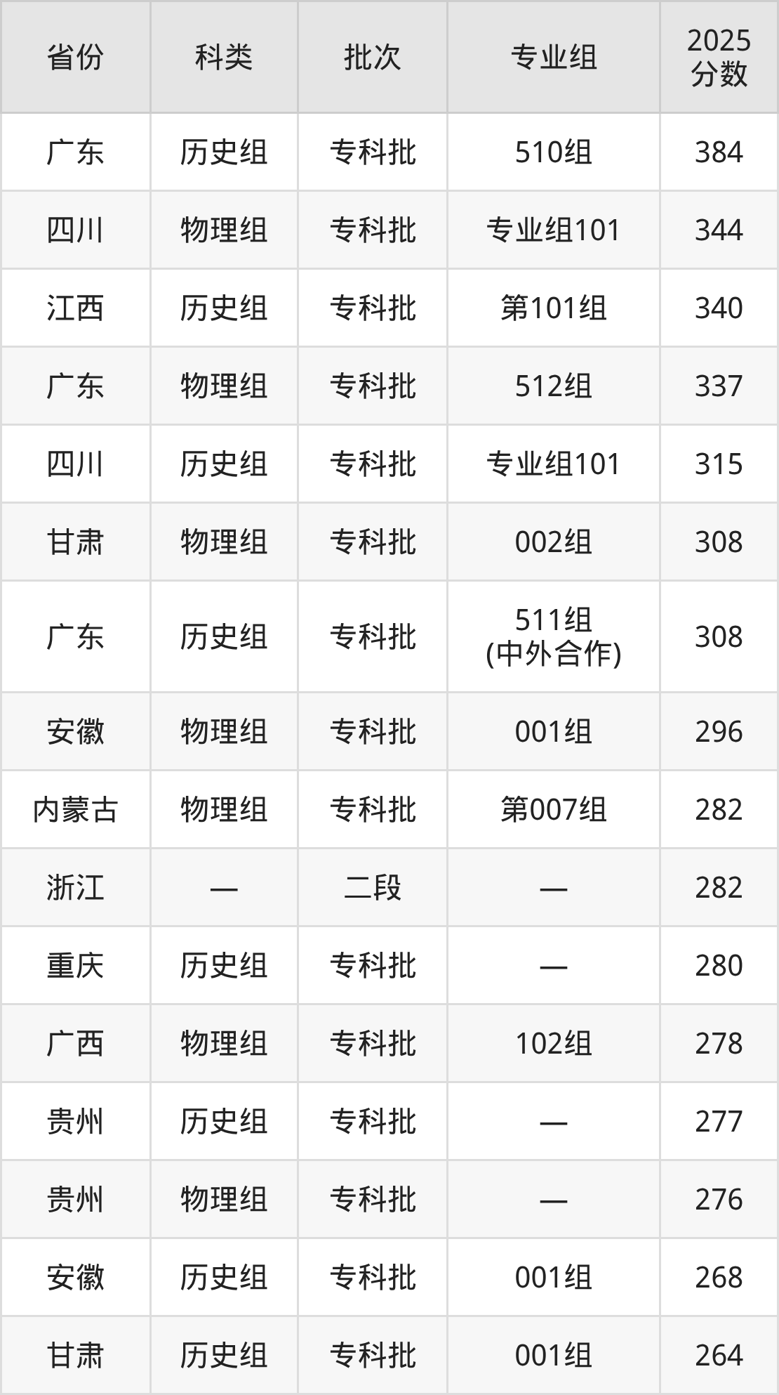 而广东地区历史组考生的分数门槛最高,2025年三亚城市职业学院510组在广东招生最低分为384分,考生至少要超专科线169分才有可能被录取。