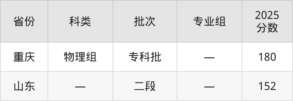 三亚城市职业学院在省外招生的最低分为152分,其中山东地区考生上三亚城市职业学院的分数门槛最低,考生成绩超二段线2分(152分)可上。其次是重庆物理组考生,上三亚城市职业学院至少要超专科线0分(180分)。