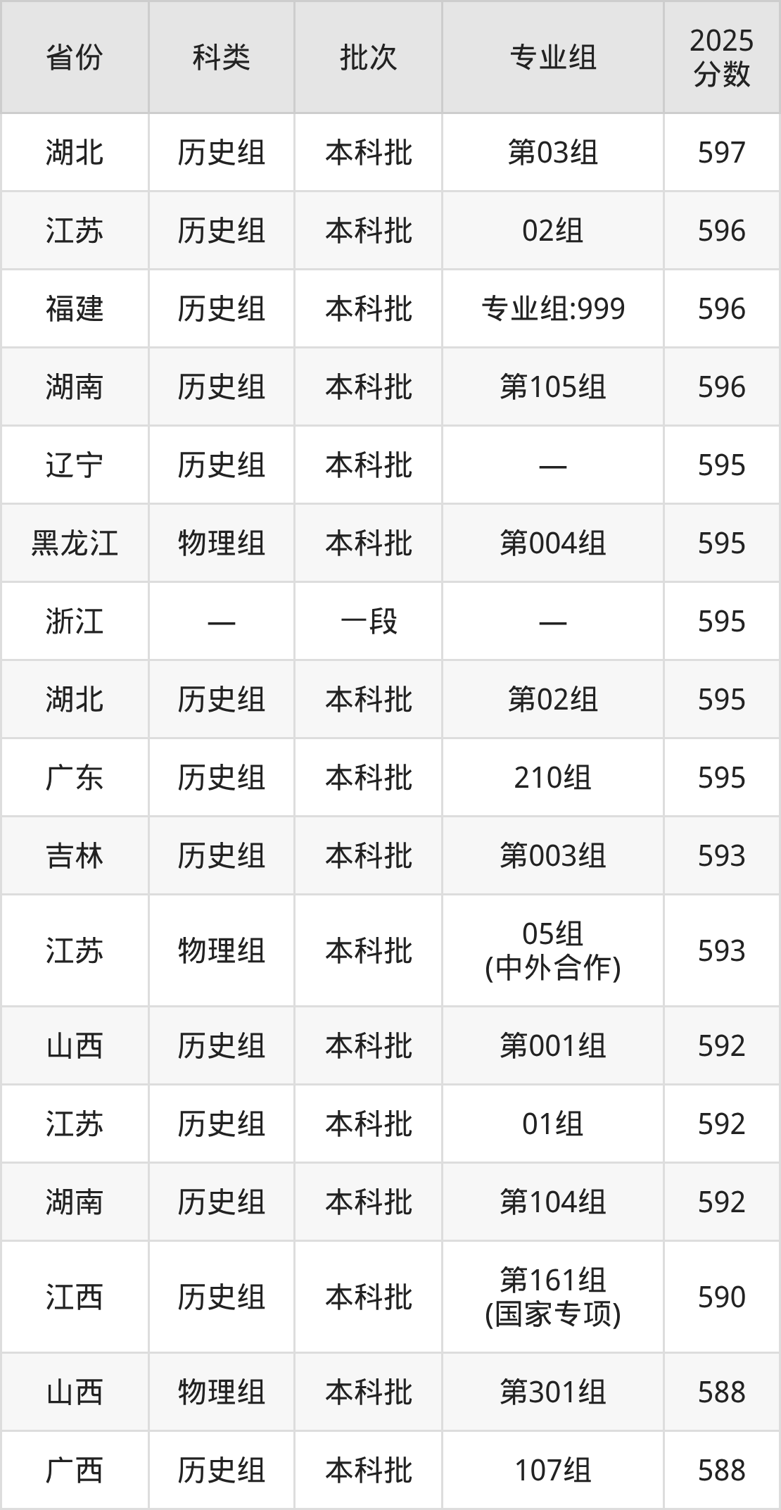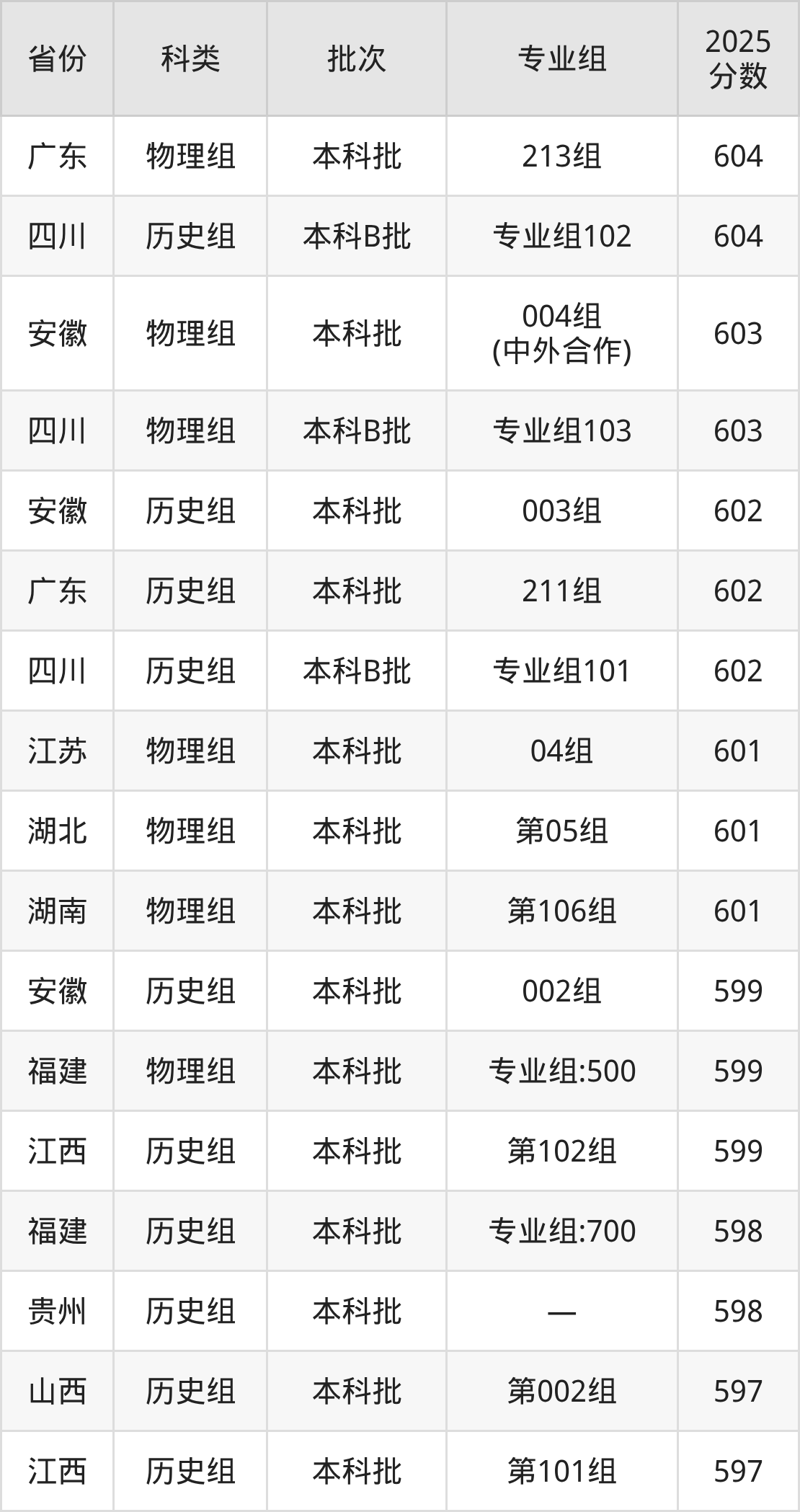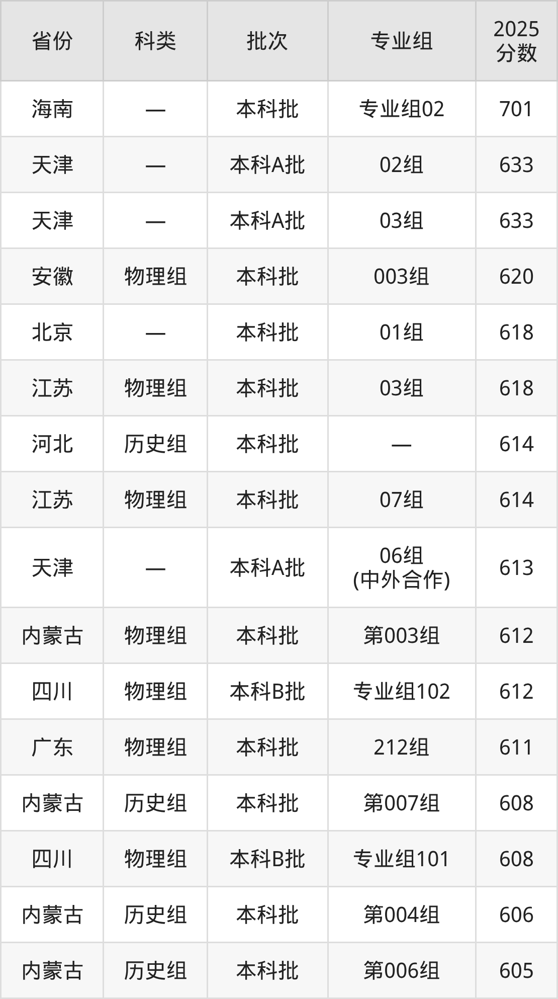 2025年西南交通大学在全国普通批次招生的录取分数范围位于402~701分之间,其中省内分数范围为569分~612分,物理组最低分专业组为“专业组104(中外合作)”,考生569分即可报考,历史组最低分专业组为“专业组101”,考生602分即可报考。
