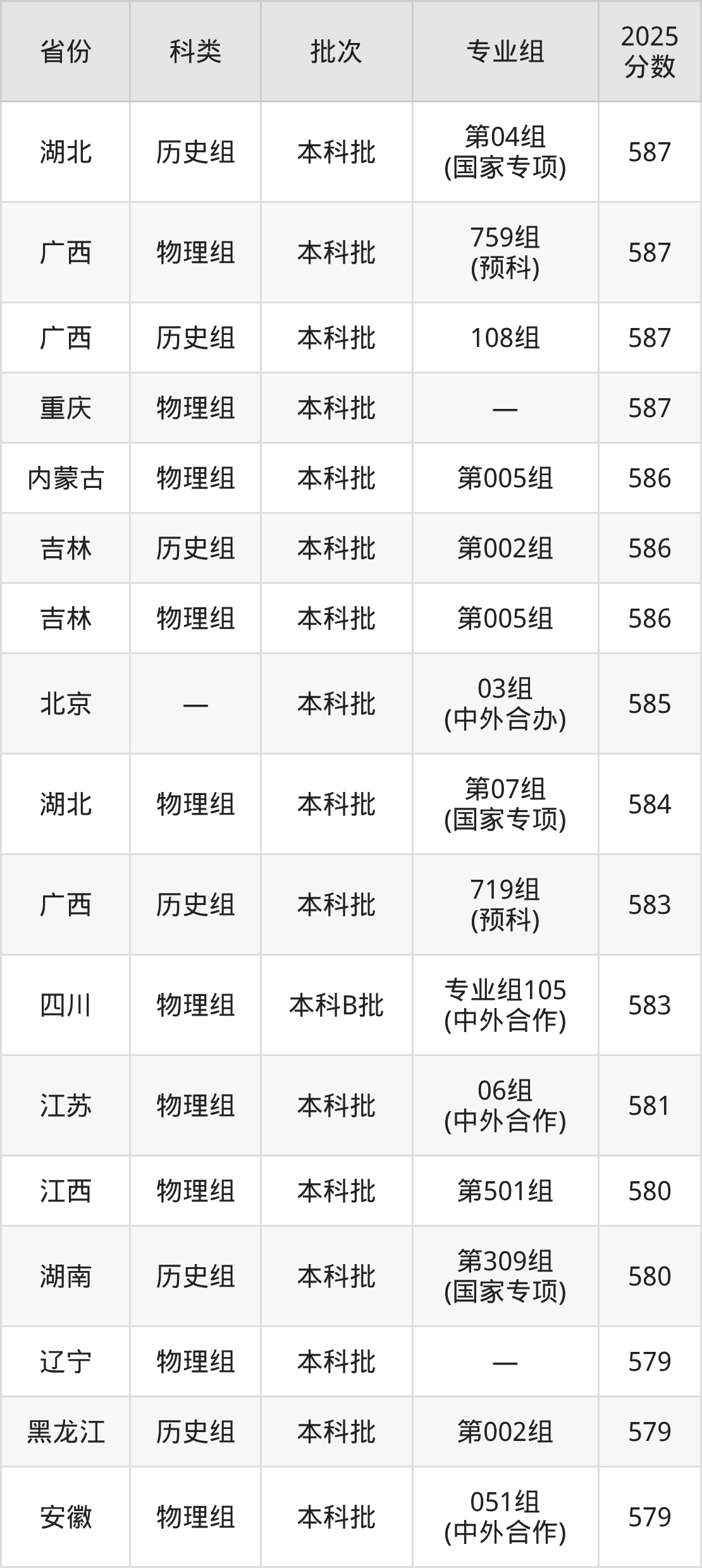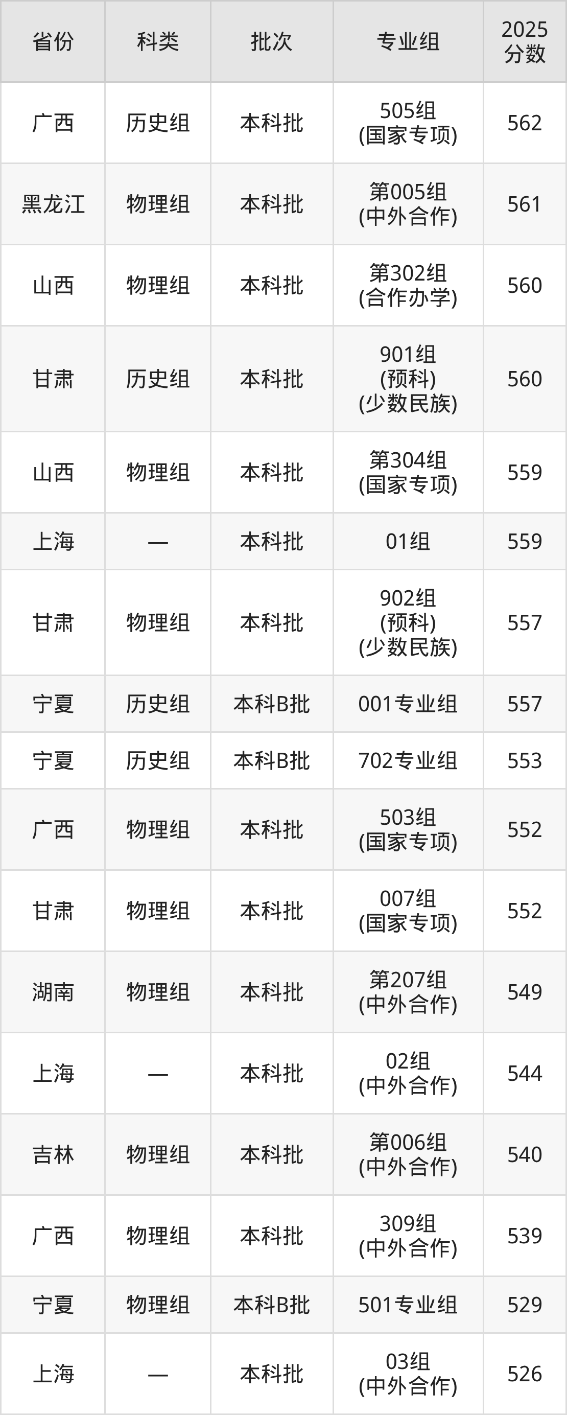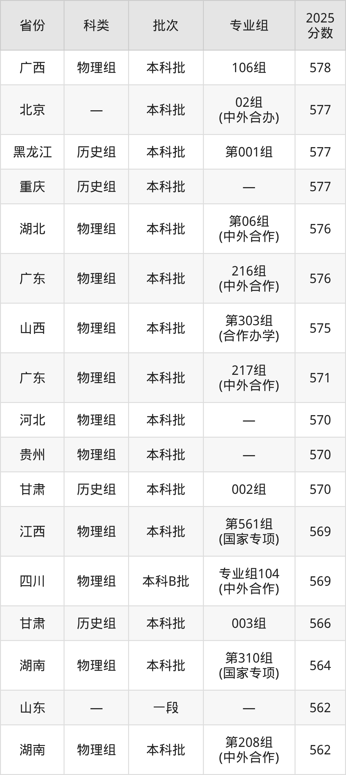2025年西南交通大学在全国普通批次招生的录取分数范围位于402~701分之间,其中省内分数范围为569分~612分,物理组最低分专业组为“专业组104(中外合作)”,考生569分即可报考,历史组最低分专业组为“专业组101”,考生602分即可报考。