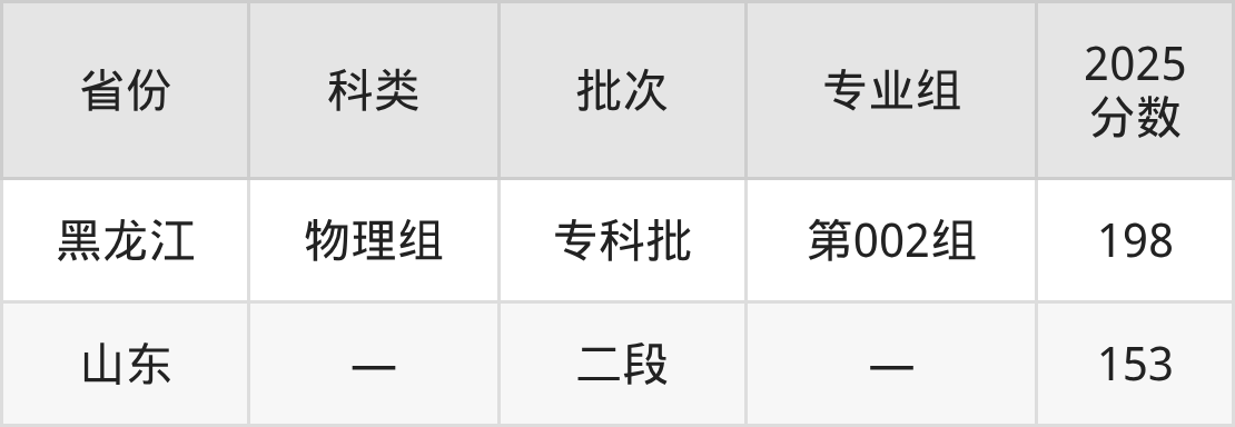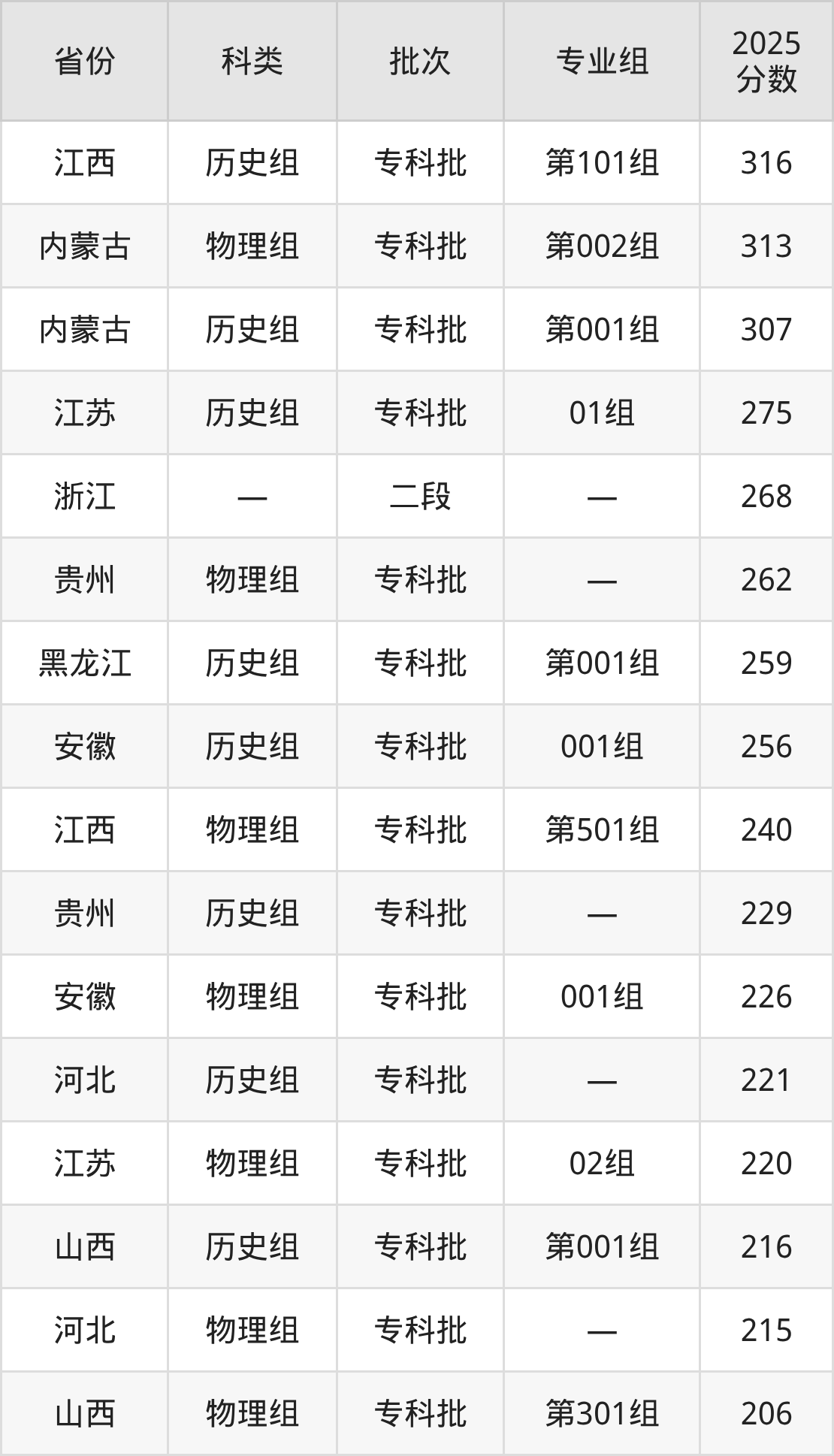 而江西地区历史组考生的分数门槛最高,2025年潍坊工商职业学院第101组在江西招生最低分为316分,考生至少要超专科线26分才有可能被录取。