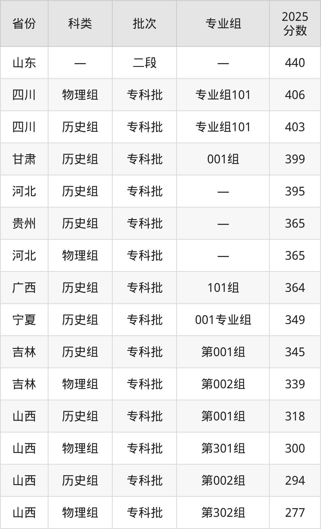 2025年忻州职业技术学院在全国普通批次招生的录取分数范围位于277~440分之间,其中省内分数范围为277分~318分,历史组最低分专业组为“第002组”,考生294分即可报考,物理组最低分专业组为“第302组”,考生277分即可报考。