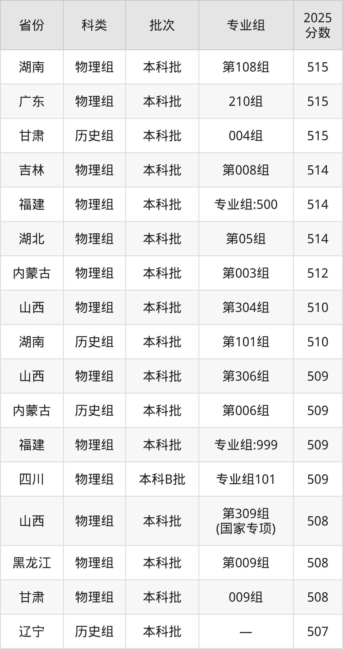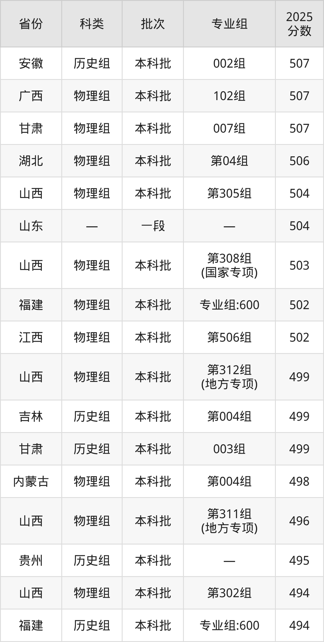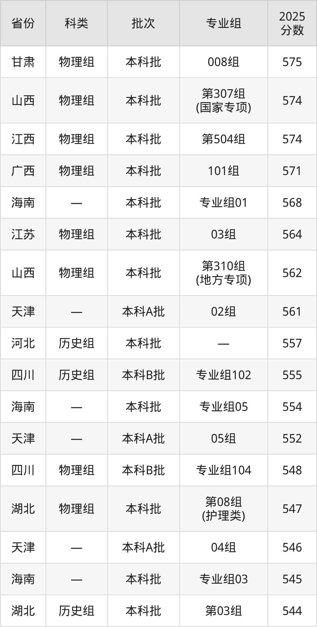 2025年山西医科大学在全国普通批次招生的录取分数范围位于415~656分之间,其中省内分数范围为494分~575分,物理组最低分专业组为“第302组”,考生494分即可报考,历史组最低分专业组为“第001组”,考生519分即可报考。