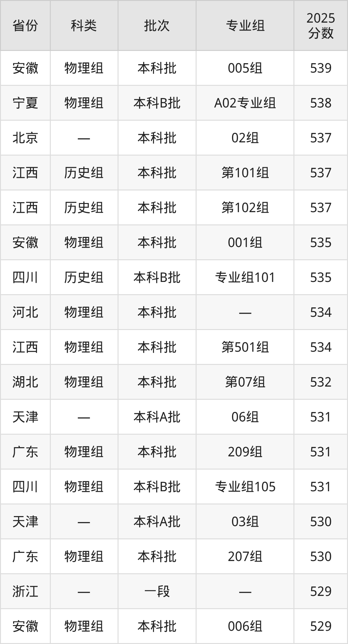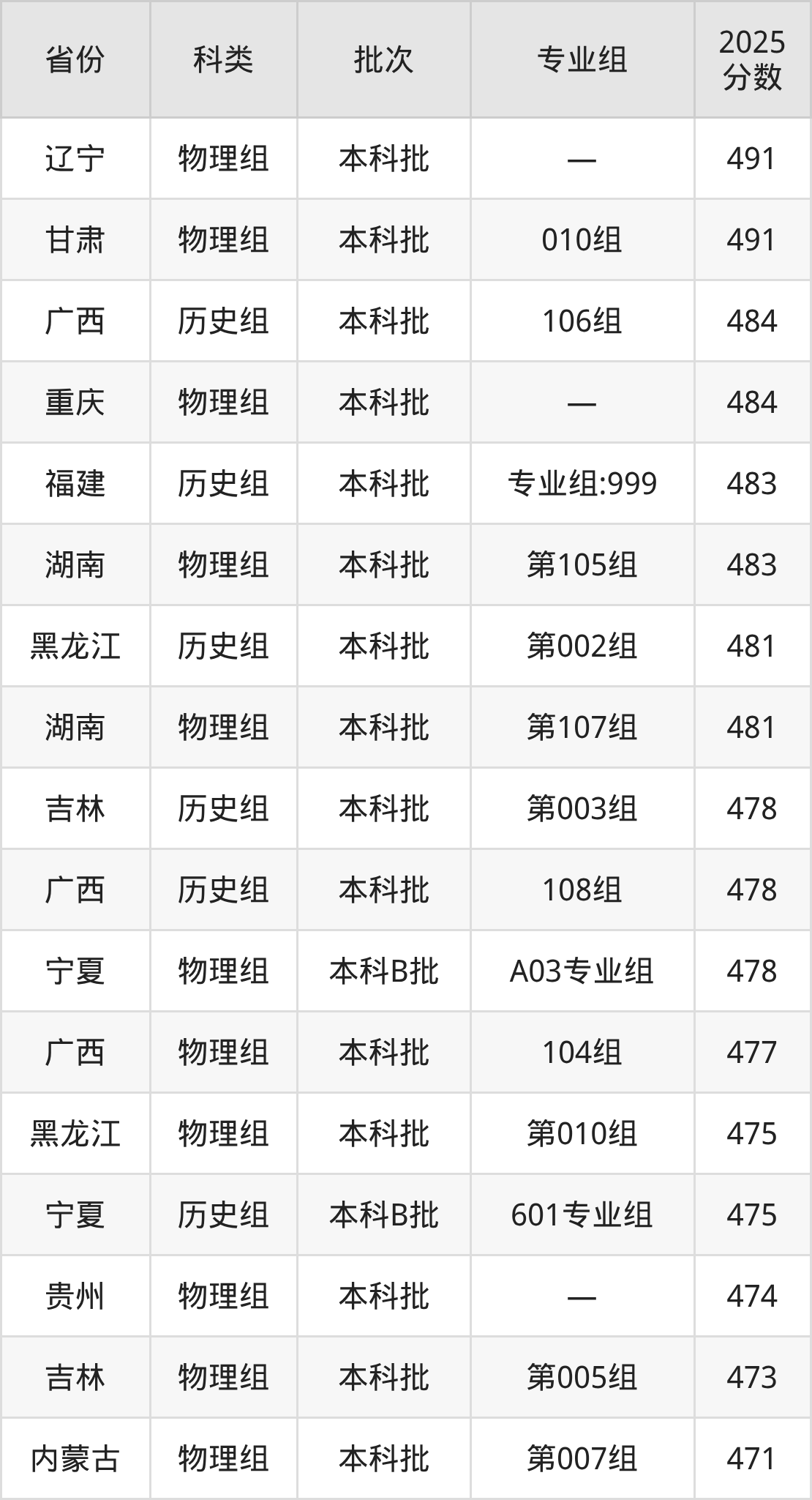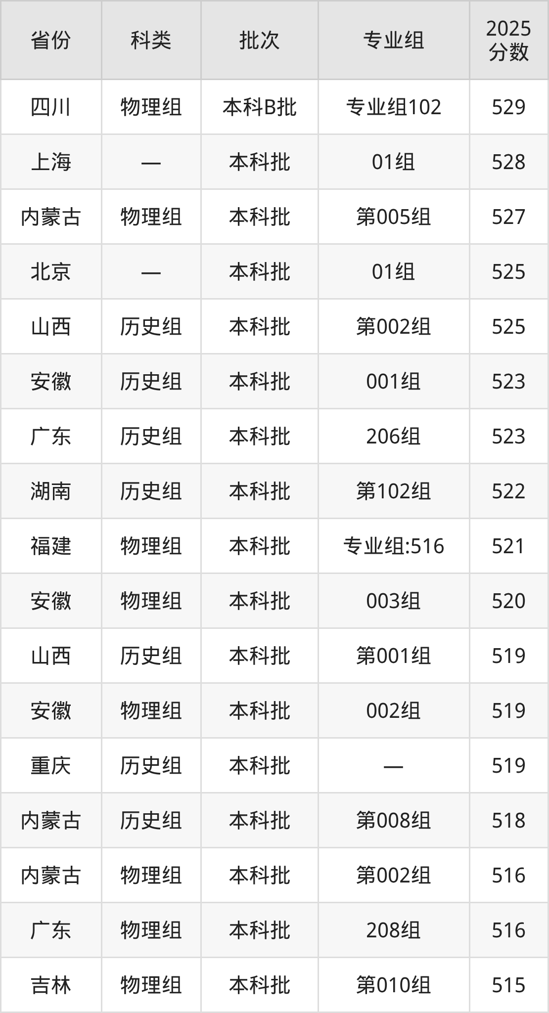2025年山西医科大学在全国普通批次招生的录取分数范围位于415~656分之间,其中省内分数范围为494分~575分,物理组最低分专业组为“第302组”,考生494分即可报考,历史组最低分专业组为“第001组”,考生519分即可报考。