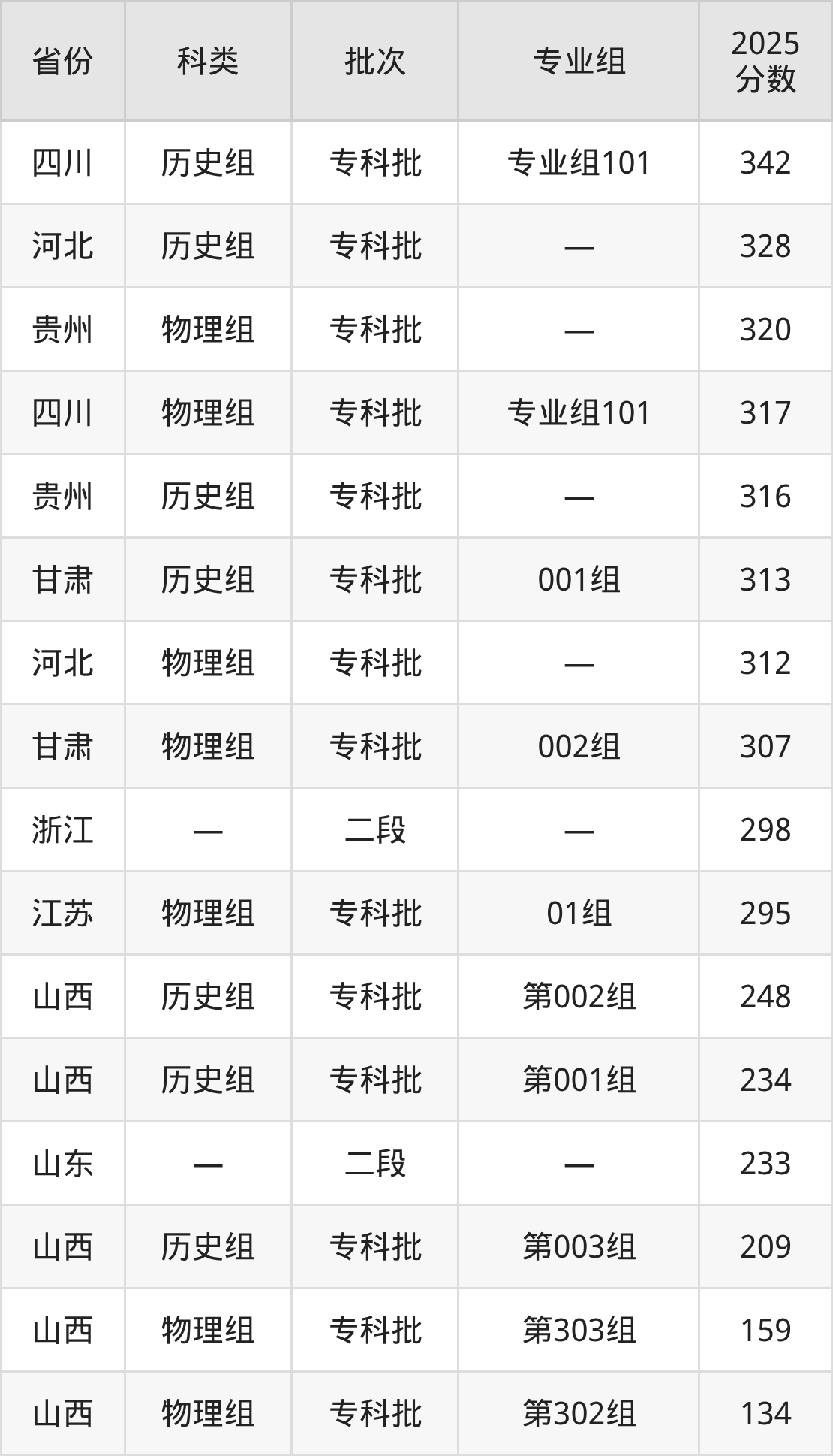 而四川地区历史组考生的分数门槛最高,2025年山西同文职业技术学院专业组101在四川招生最低分为342分,考生至少要超专科线192分才有可能被录取。