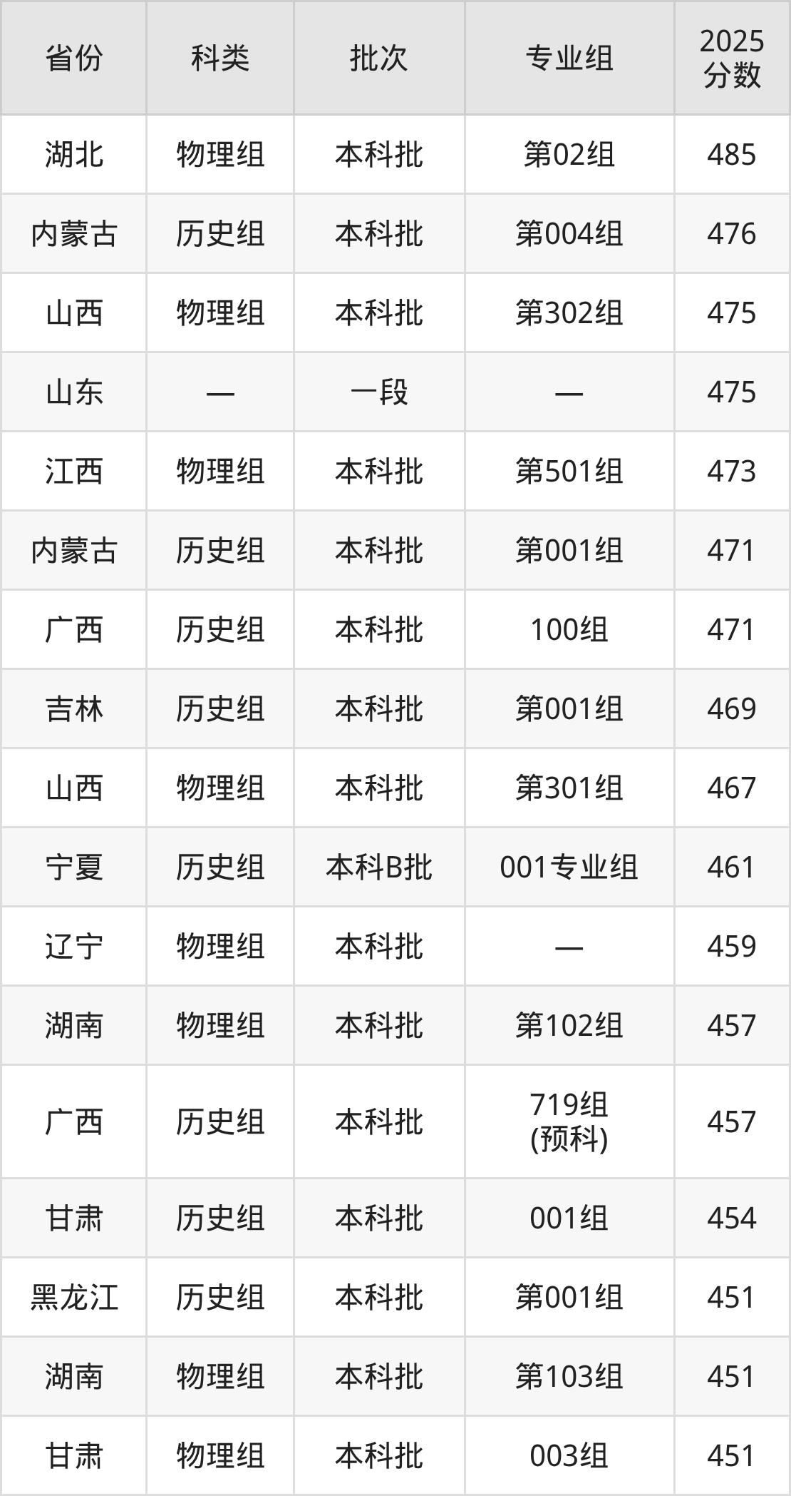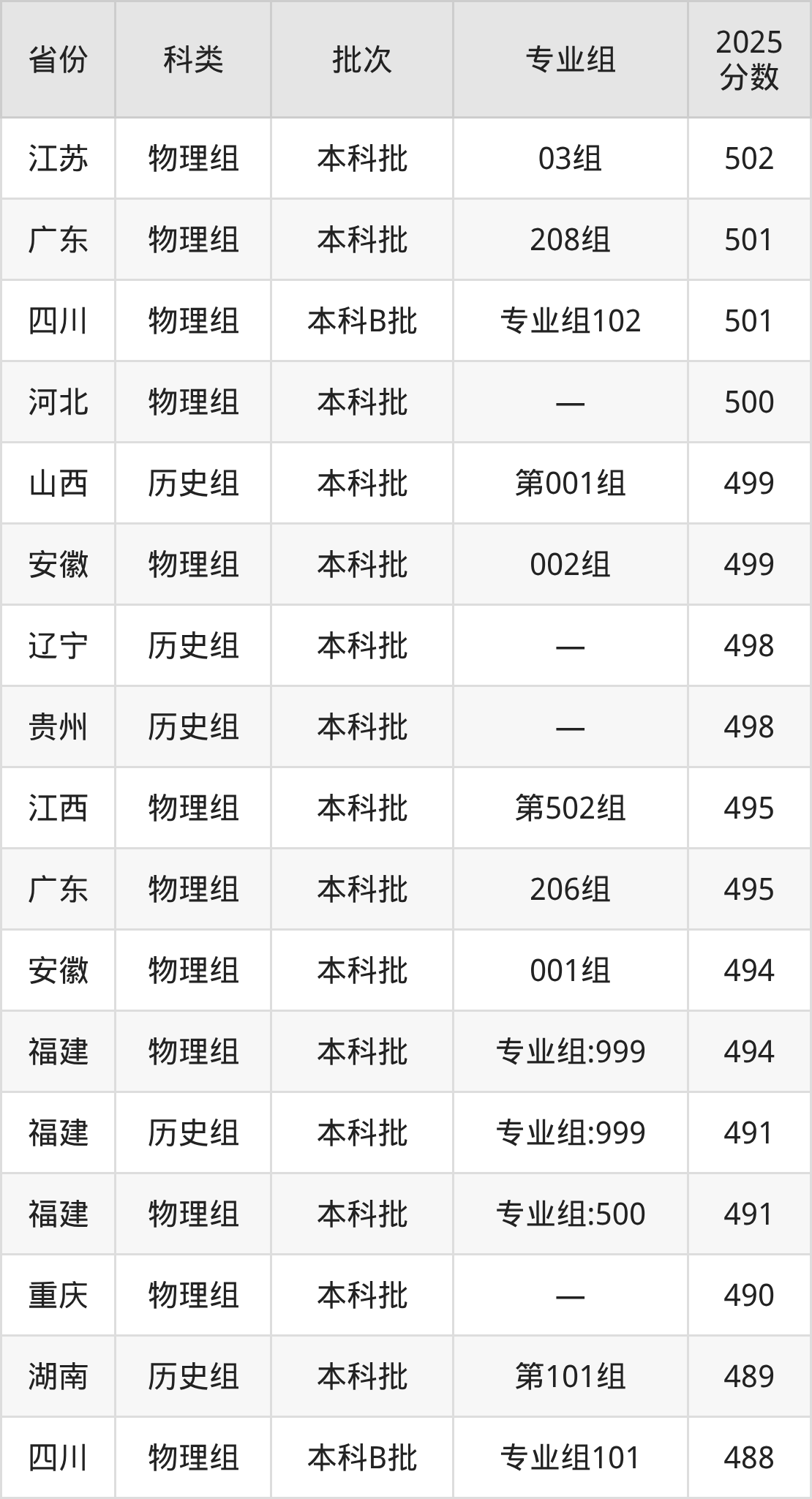 2025年武夷学院在全国普通批次招生的录取分数范围位于391~574分之间,其中省内分数范围为491分~494分,物理组最低分专业组为“专业组:500”,考生491分即可报考,历史组最低分专业组为“专业组:999”,考生491分即可报考。