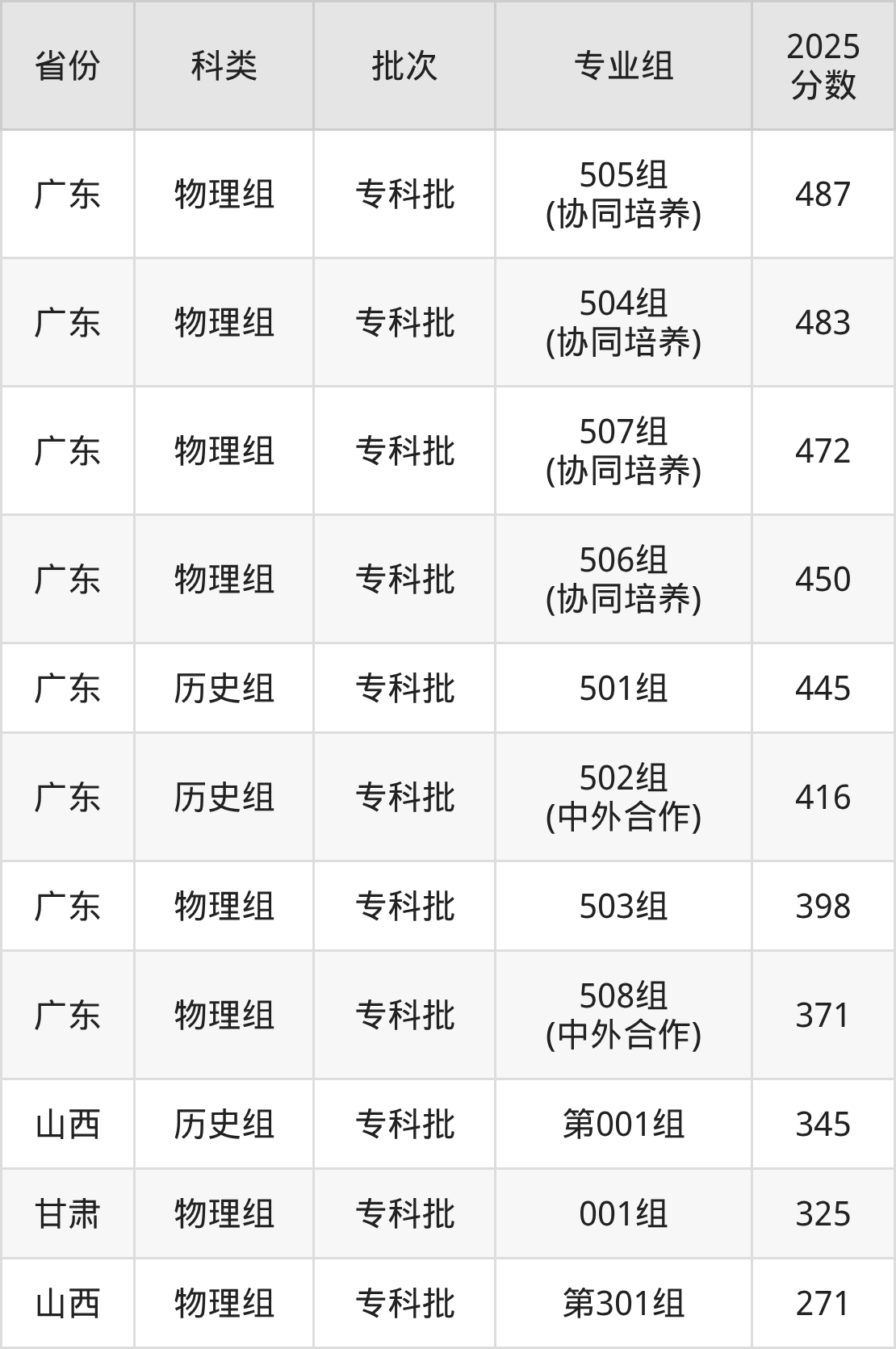 下面是广东职业技术学院2025年在全国各省的录取分数线一览表,供参考: