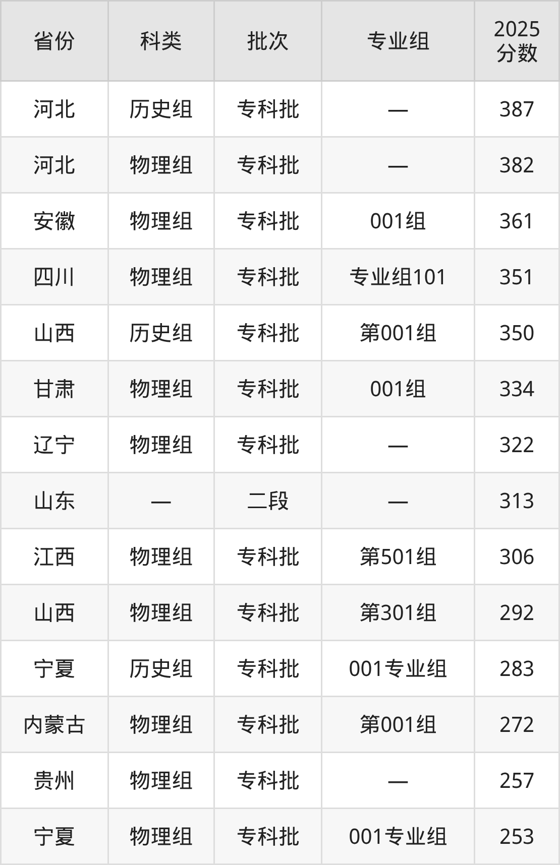 而河北地区历史组考生的分数门槛最高,2025年烟台工程职业技术学院在河北招生最低分为387分,考生至少要超专科线187分才有可能被录取。