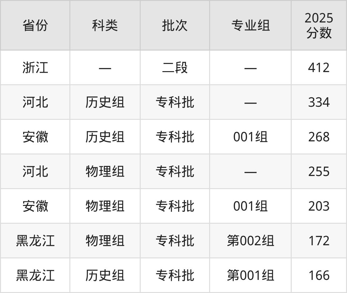 2025年民办万博科技职业学院在全国普通批次招生的录取分数范围位于166~412分之间,其中省内分数范围为203分~268分,历史组最低分专业组为“001组”,考生268分即可报考,物理组最低分专业组为“001组”,考生203分即可报考。