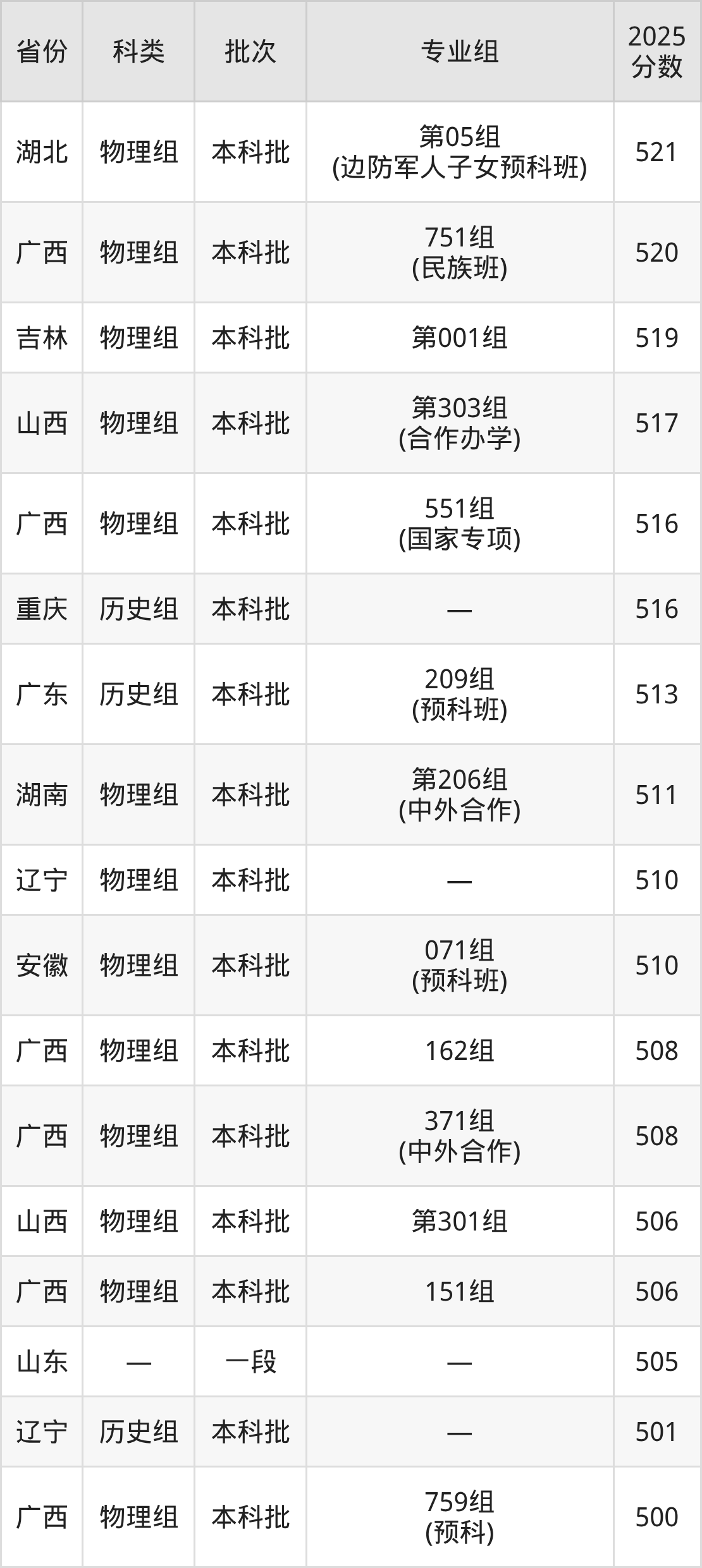 2025年桂林电子科技大学在全国普通批次招生的录取分数范围位于388~629分之间,其中壮族自治区内分数范围为468分~548分,物理组最低分专业组为“951组(预科)”,考生485分即可报考,历史组最低分专业组为“719组(预科)”,考生468分即可报考。