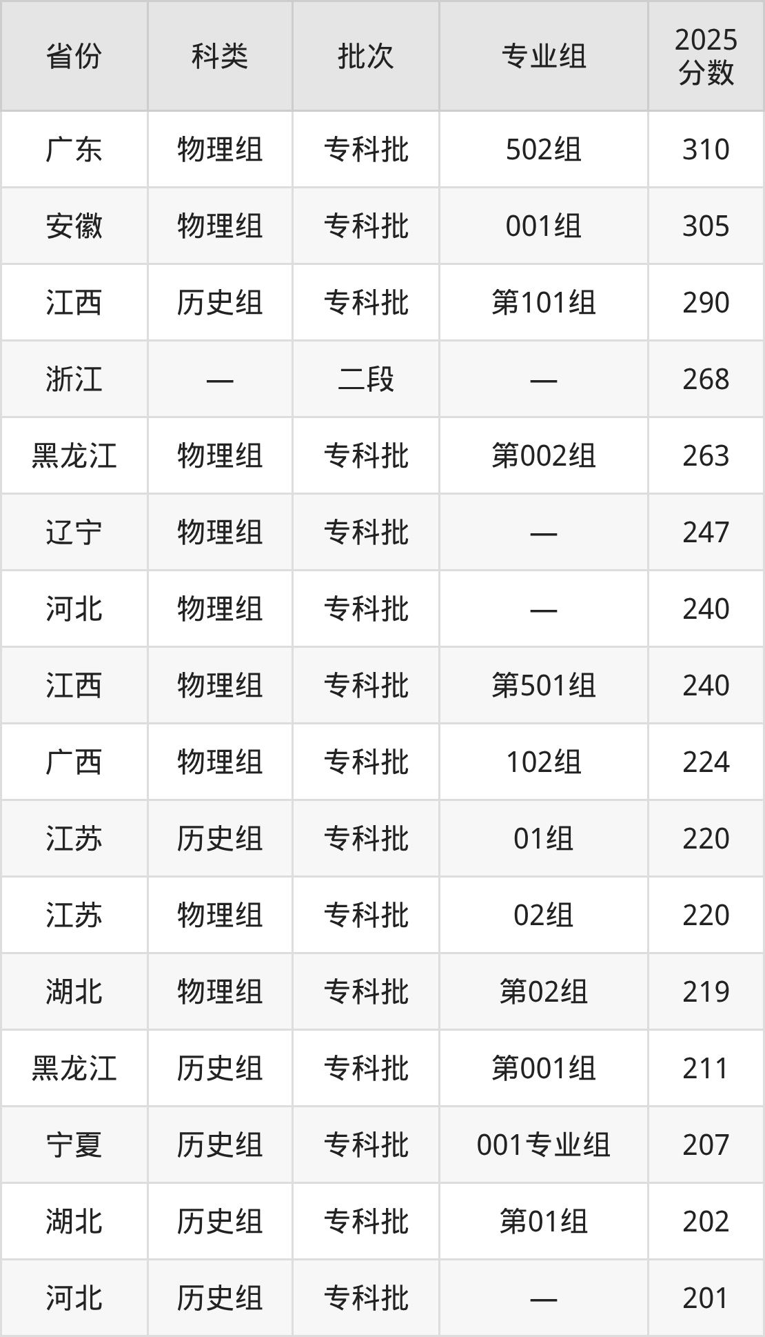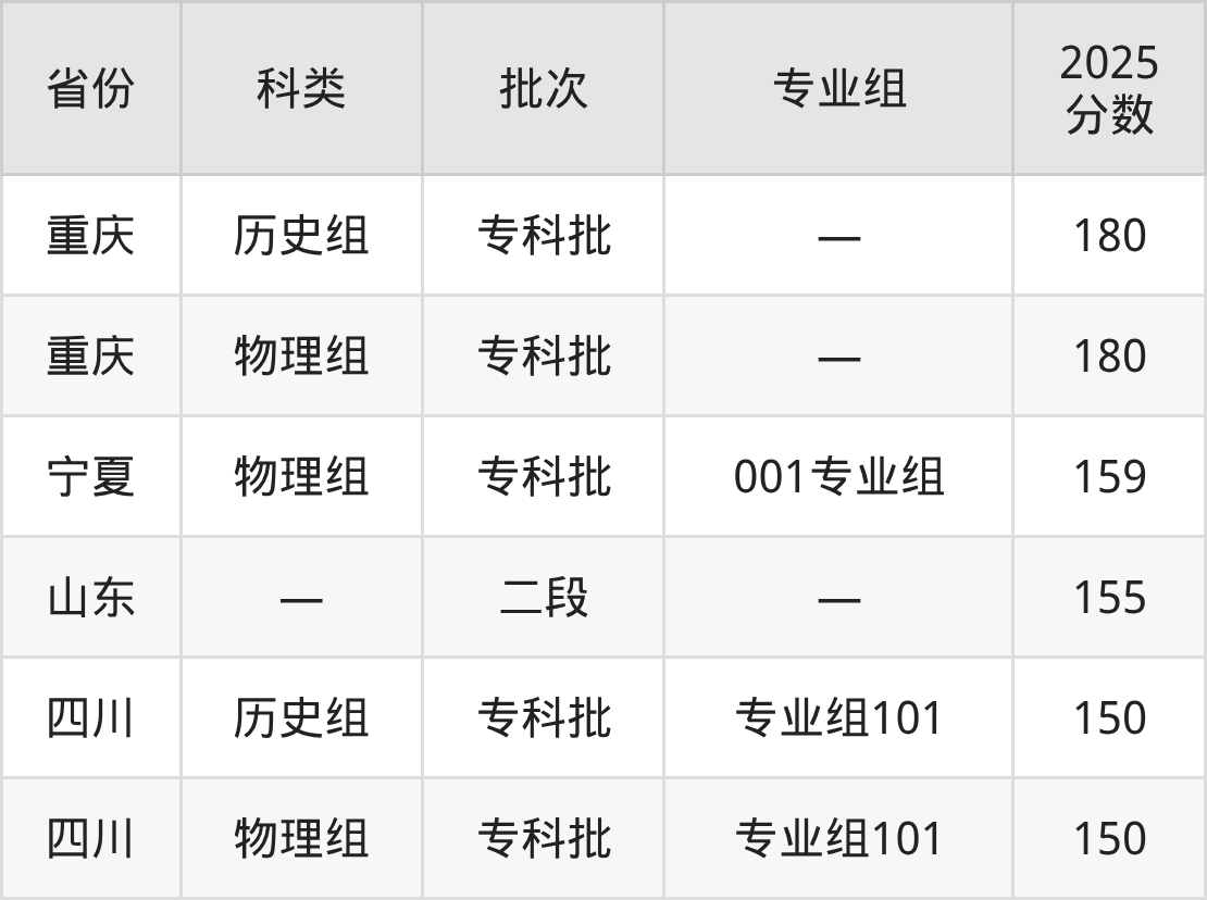 下面是遂宁职业学院2025年在全国各省的录取分数线一览表,供参考: