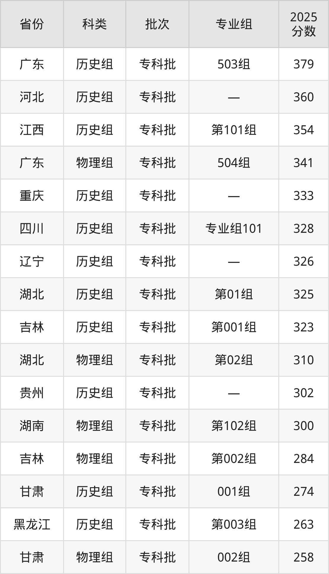 而广东地区历史组考生的分数门槛最高,2025年哈尔滨幼儿师范高等专科学校503组在广东招生最低分为379分,考生至少要超专科线164分才有可能被录取。
