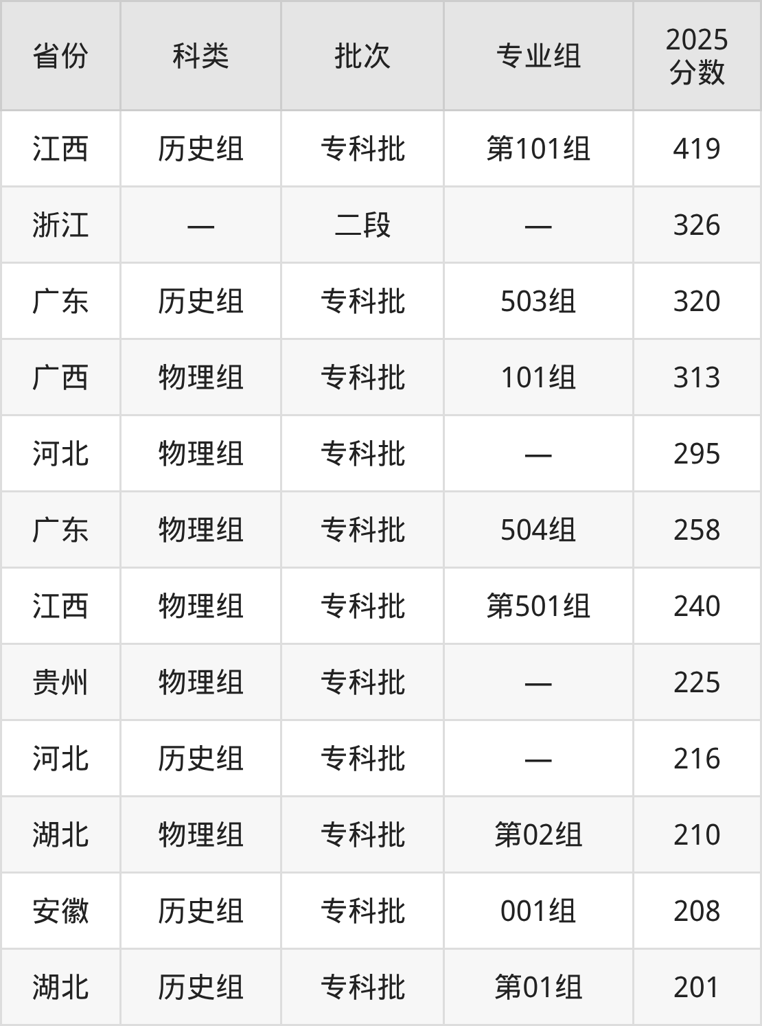 而江西地区历史组考生的分数门槛最高,2025年岳阳现代服务职业学院第101组在江西招生最低分为419分,考生至少要超专科线129分才有可能被录取。