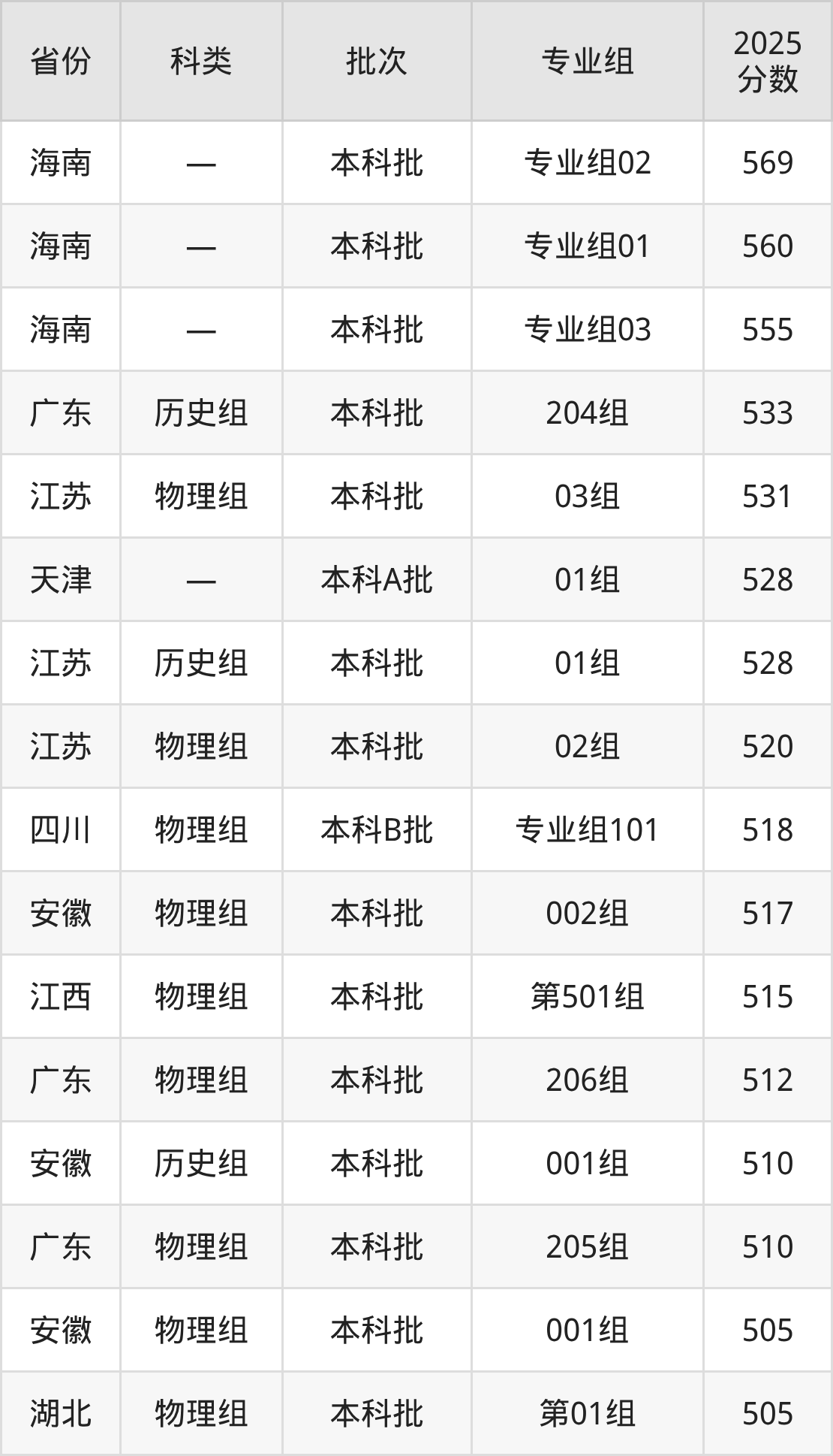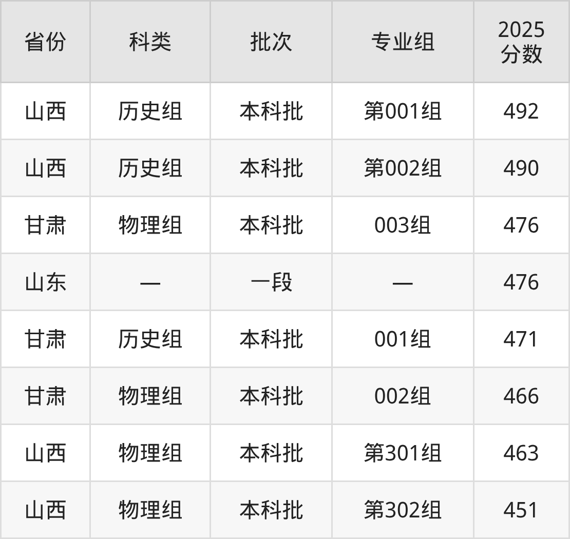 2025年山西科技学院在全国普通批次招生的录取分数范围位于451~569分之间,其中省内分数范围为451分~492分,历史组最低分专业组为“第002组”,考生490分即可报考,物理组最低分专业组为“第302组”,考生451分即可报考。