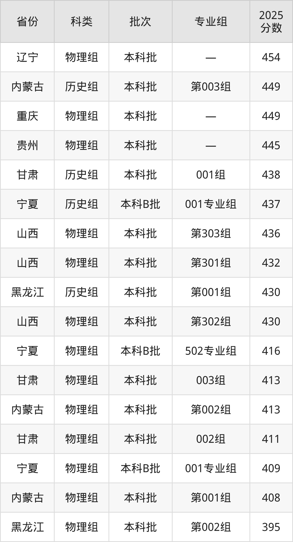 2025年晋中信息学院在全国普通批次招生的录取分数范围位于395~506分之间,其中省内分数范围为430分~466分,历史组最低分专业组为“第002组”,考生460分即可报考,物理组最低分专业组为“第302组”,考生430分即可报考。